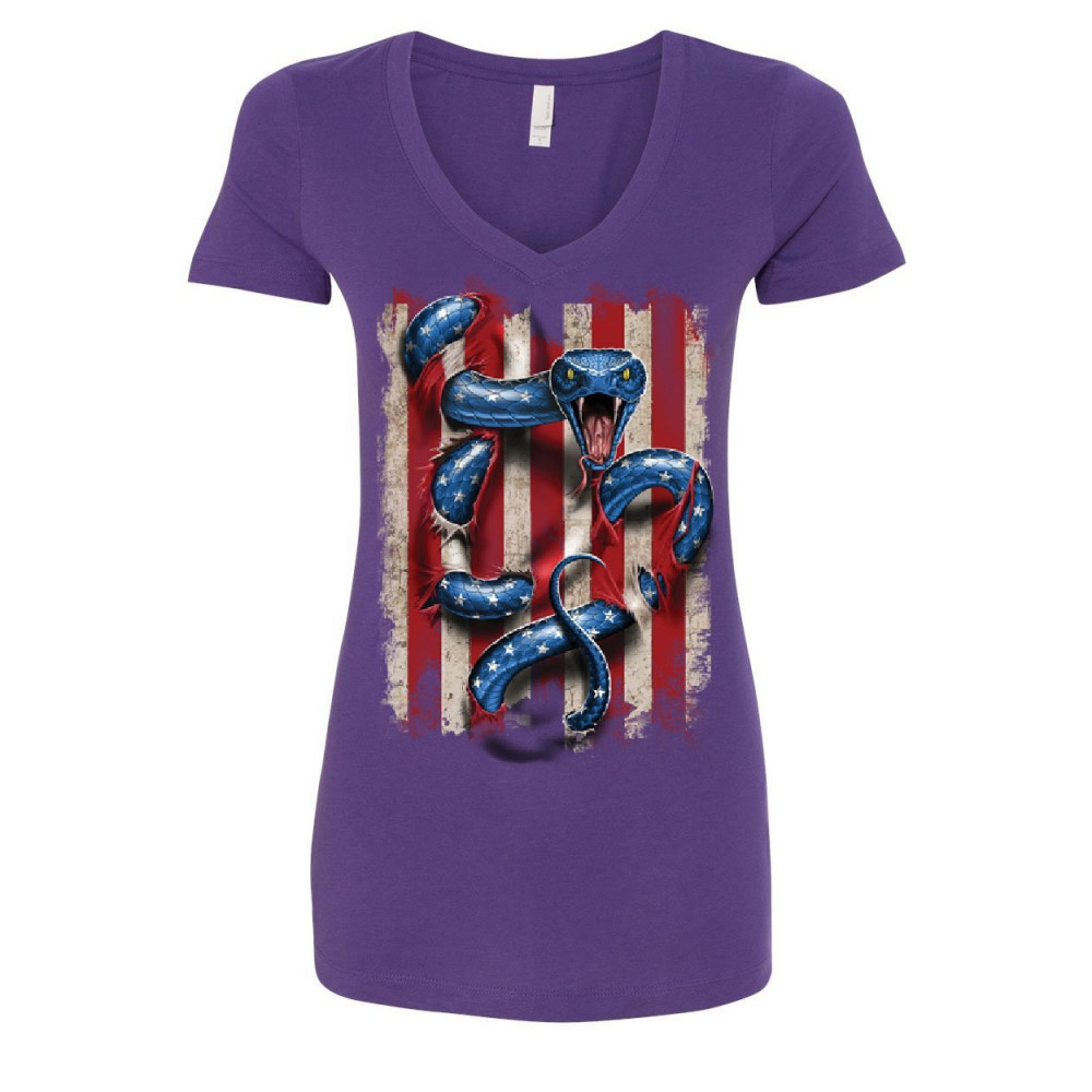 AMERICAN SERPENT women's v-neck t-shirt don't tread on me gadsden flag purple
