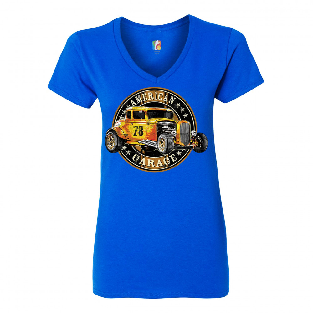 AMERICAN GARAGE women's v-neck t-shirt retro hot rod vintage muscle car tee royal blue