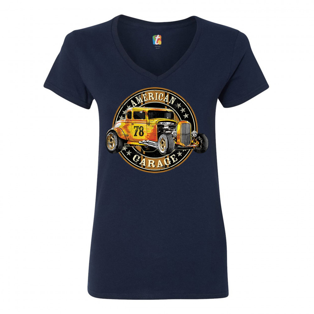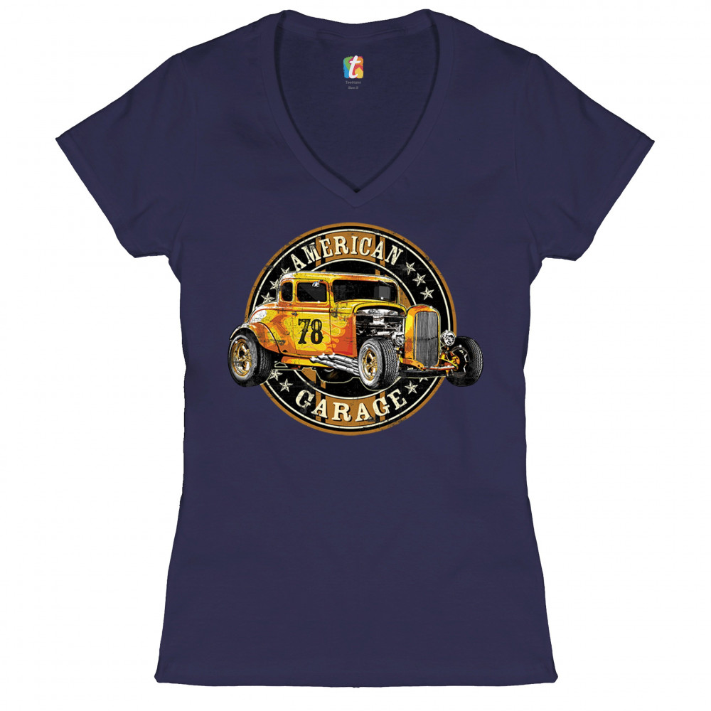 AMERICAN GARAGE women's v-neck t-shirt retro hot rod vintage muscle car tee navy blue