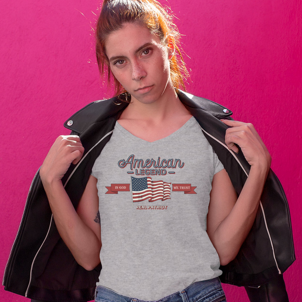 A patriotic print saying "American Legend, Real Patriot" and featuring the American Flag in the center. On red stripes by it's sides it says "in God we trust". Great choice to wear on Independence Day or any other patriotic holiday.