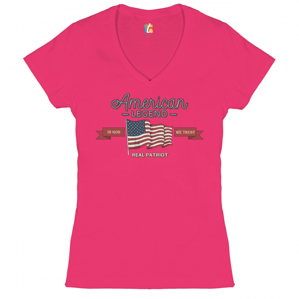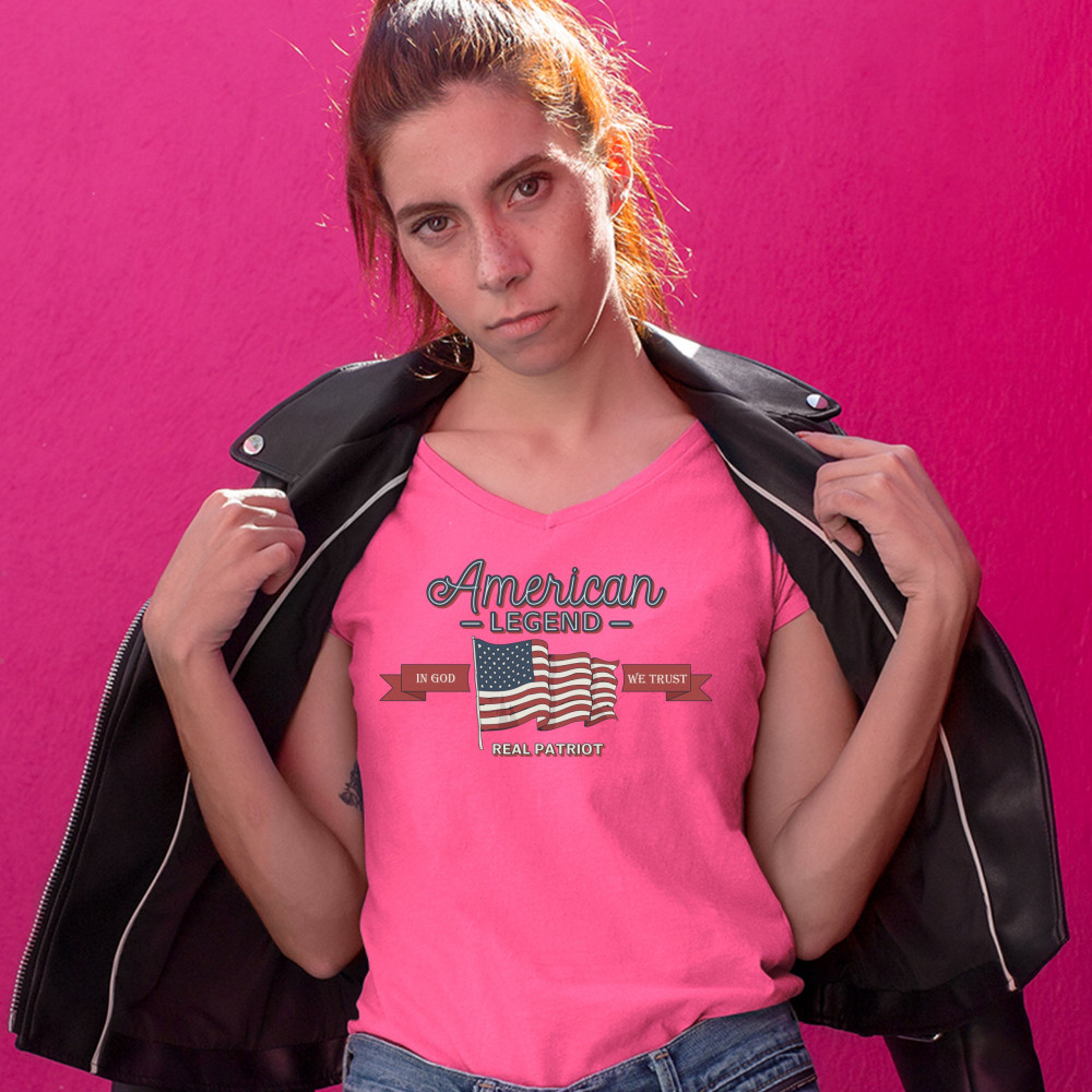 A patriotic print saying "American Legend, Real Patriot" and featuring the American Flag in the center. On red stripes by it's sides it says "in God we trust". Great choice to wear on Independence Day or any other patriotic holiday.