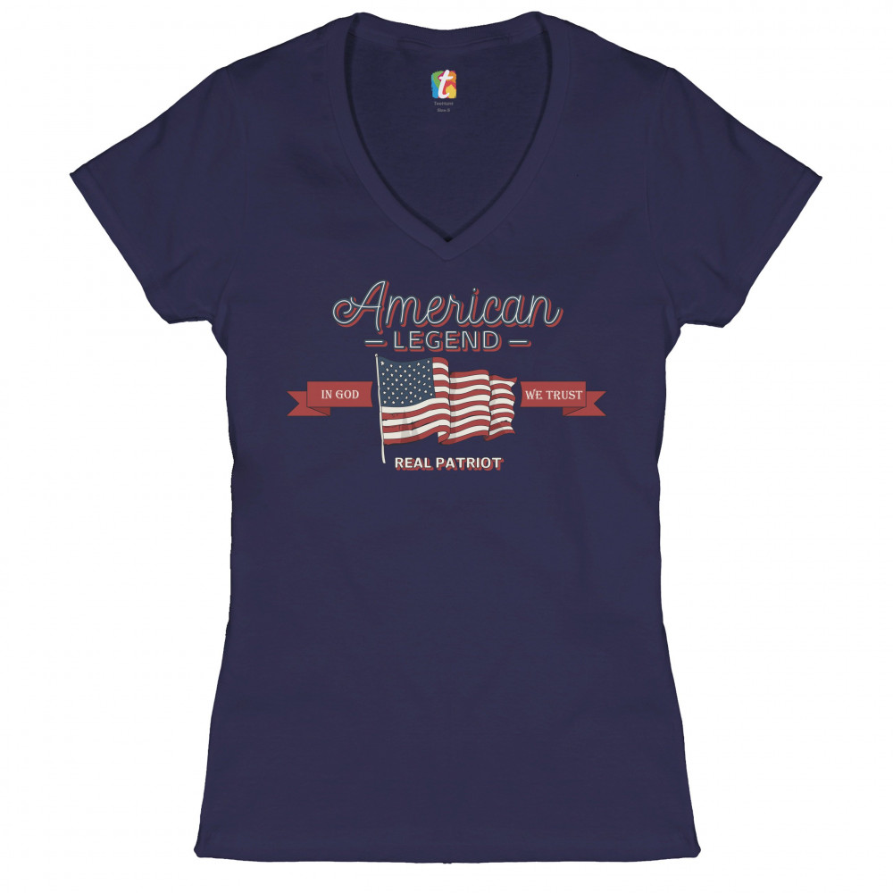A patriotic print saying "American Legend, Real Patriot" and featuring the American Flag in the center. On red stripes by it's sides it says "in God we trust". Great choice to wear on Independence Day or any other patriotic holiday.