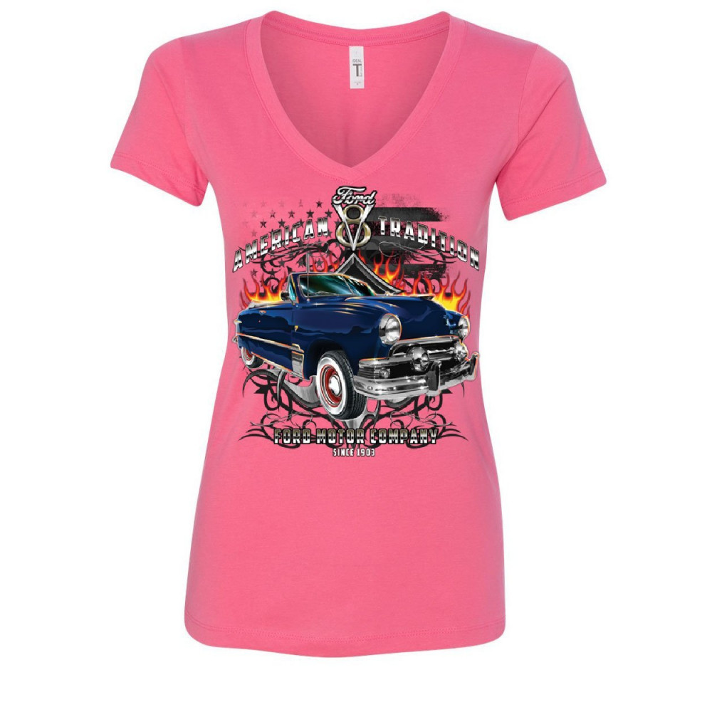 AMERICAN TRADITION ford motor company women's v-neck t-shirt classic since 1903 pink