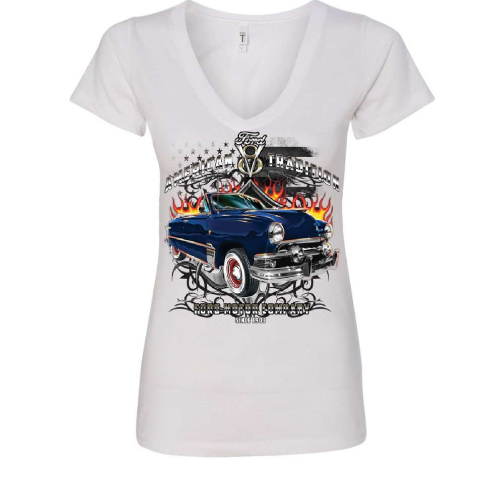 AMERICAN TRADITION ford motor company women's v-neck t-shirt classic since 1903 white