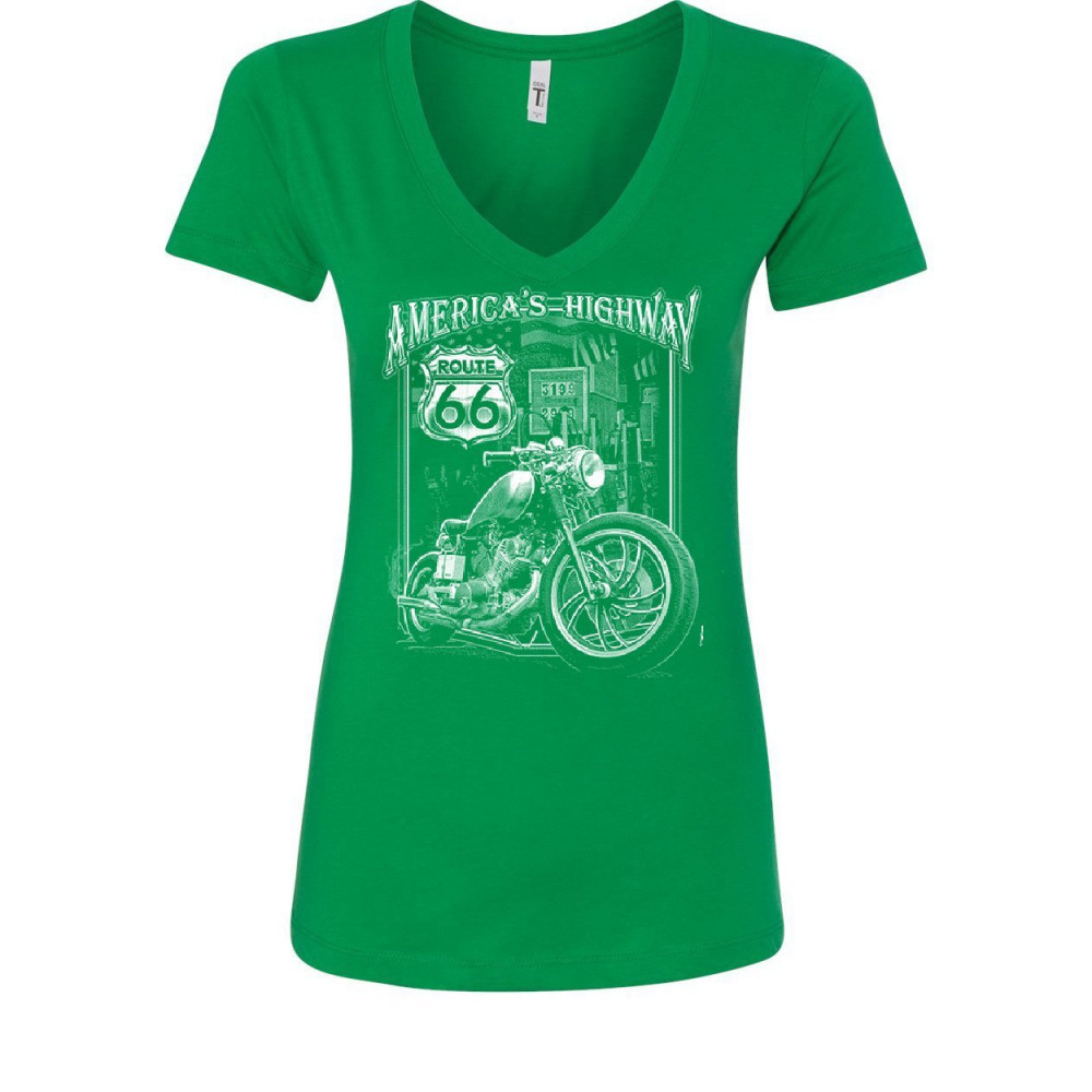 AMERICA'S HIGHWAY HISTORIC ROUTE 66 america's highway women's v-neck t-shirt route 66 mc motorcycle chopper bobber green