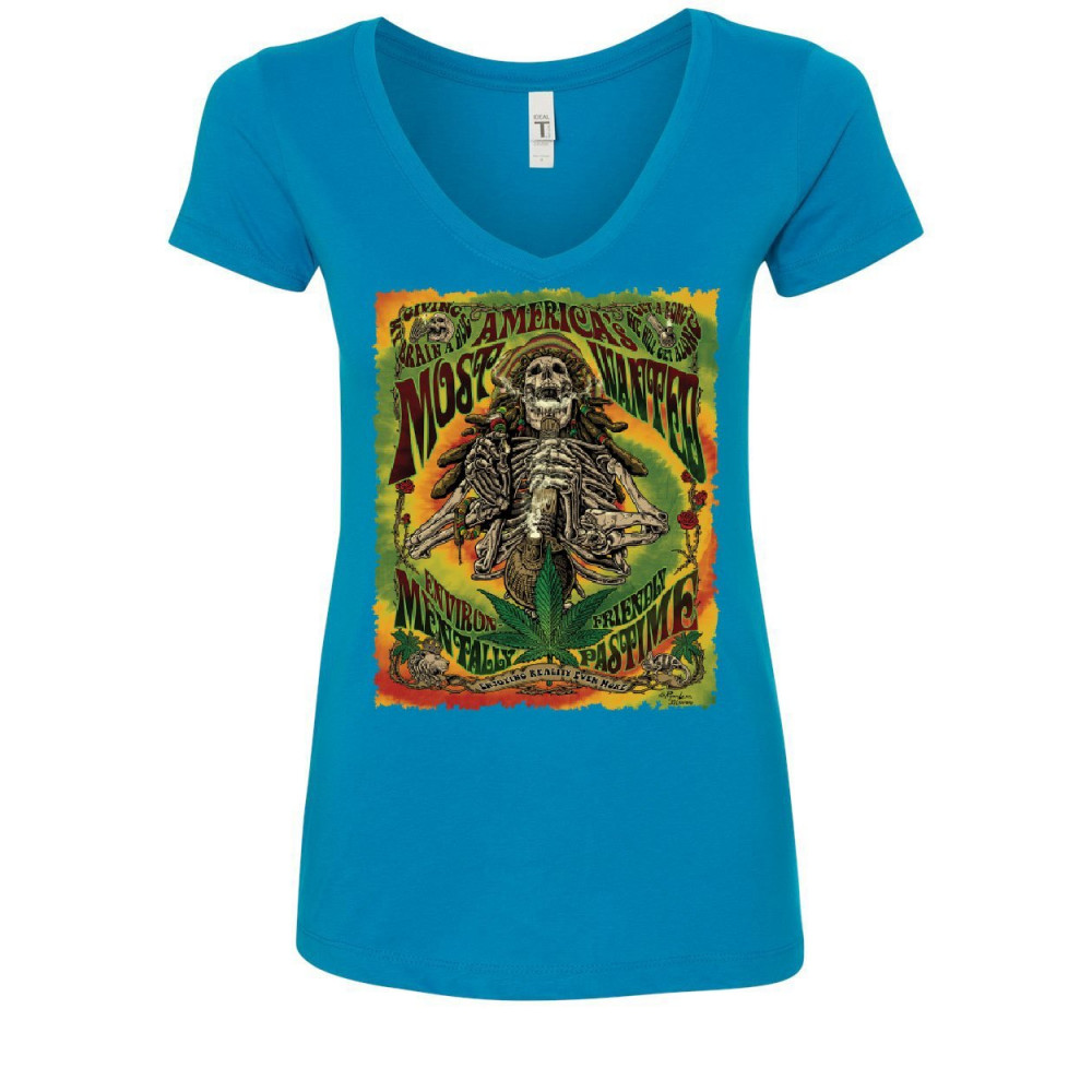 AMERICA'S MOST WANTED women's v-neck t-shirt 420 smoking weed marijuana rasta turquoise