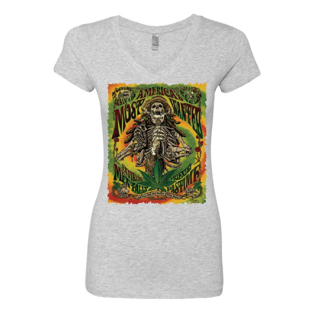 AMERICA'S MOST WANTED women's v-neck t-shirt 420 smoking weed marijuana rasta gray