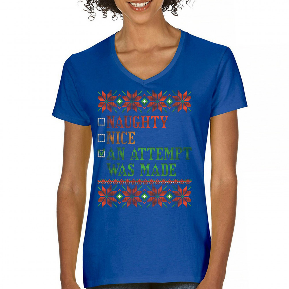 AN ATTEMPT WAS MADE women's v-neck t-shirt ugly sweater naughty or nice tee royal blue