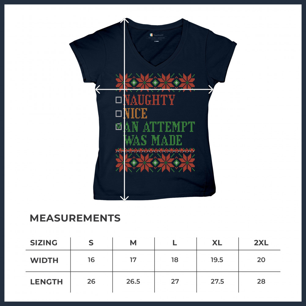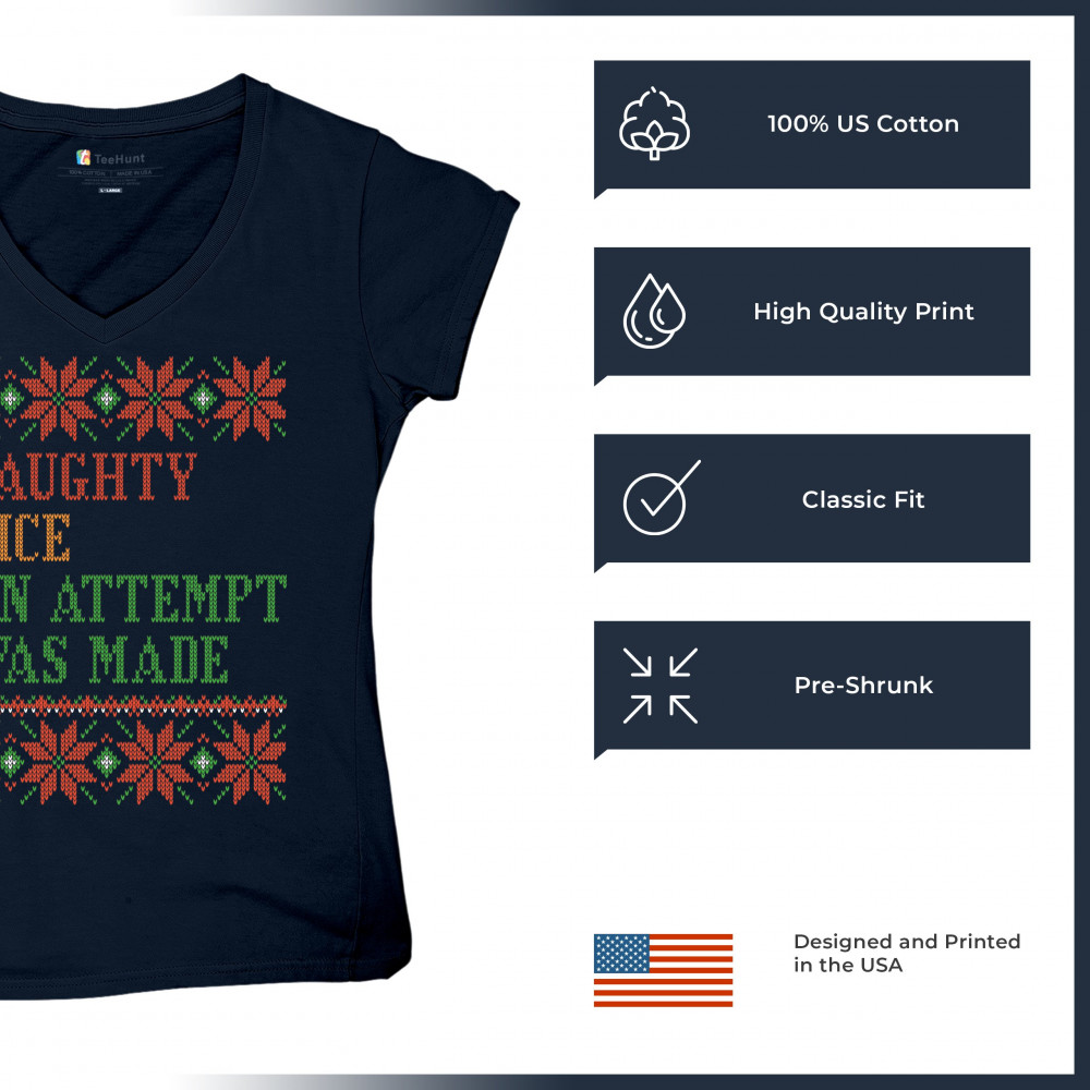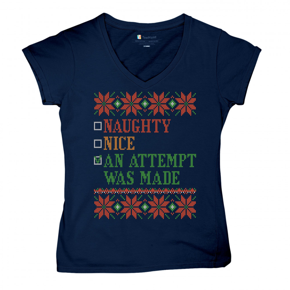 AN ATTEMPT WAS MADE women's v-neck t-shirt ugly sweater naughty or nice tee navy blue