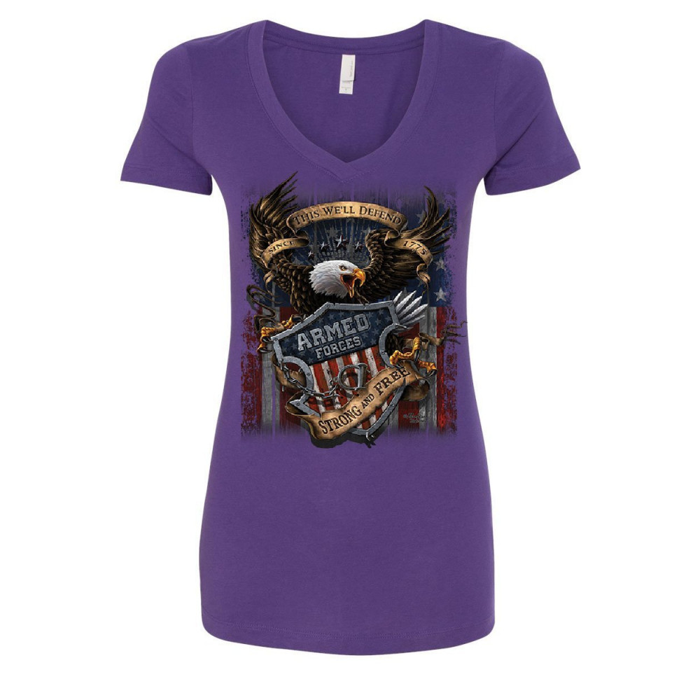 ARMED FORCES BALD EAGLE women's v-neck t-shirt army this we'll defend us flag purple