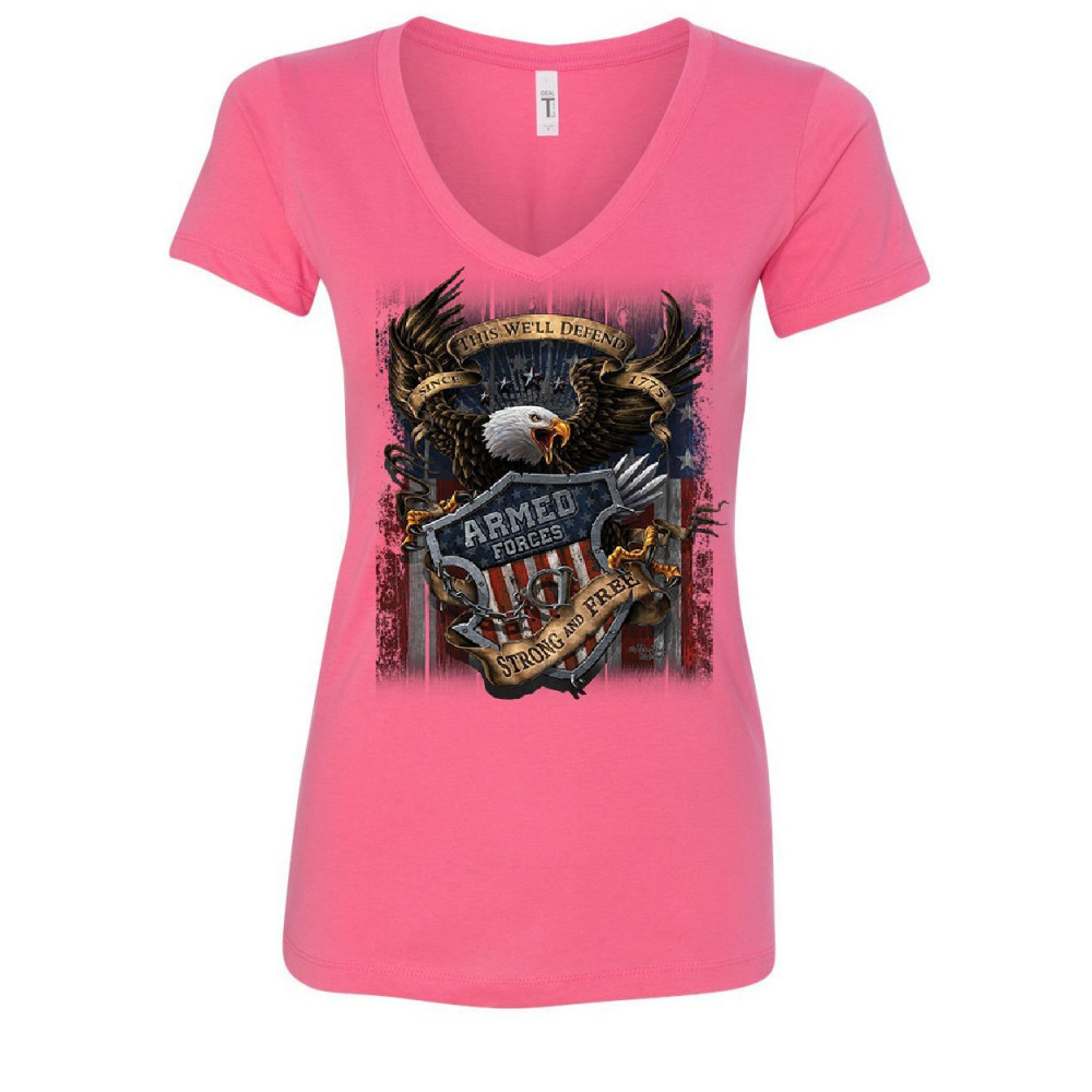 ARMED FORCES BALD EAGLE women's v-neck t-shirt army this we'll defend us flag pink