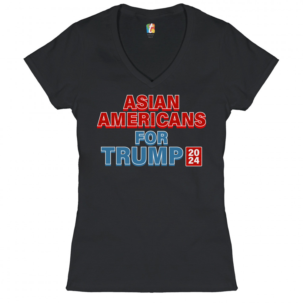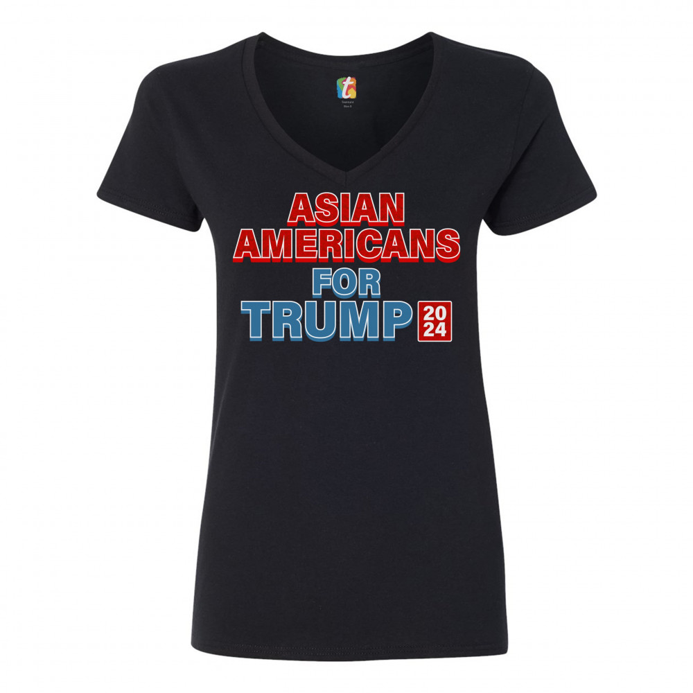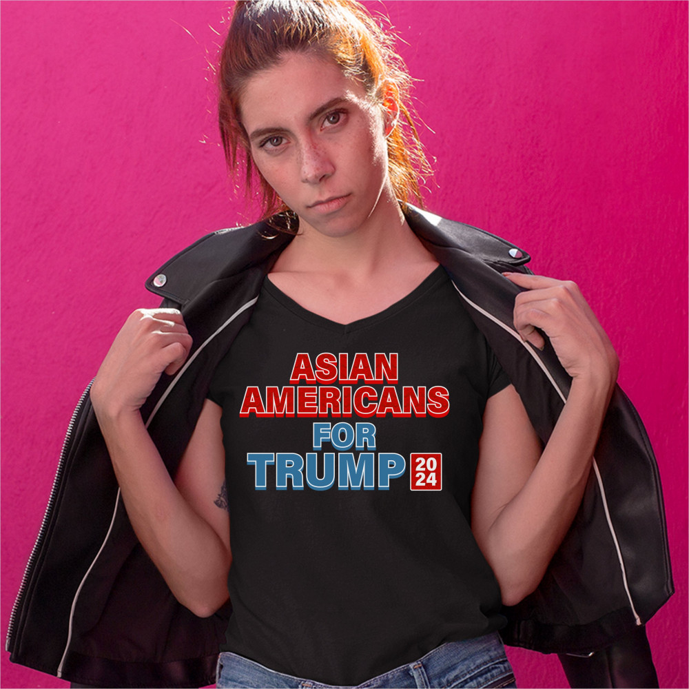 A political print saying "Asian Americans for Trump 2024". The words "Asian Americans" and the square with 2024 also have a pattern inside. A great choice to wear for a Trump rally or give as a gift to a Donald Trump supporter before 2024 presidential ele