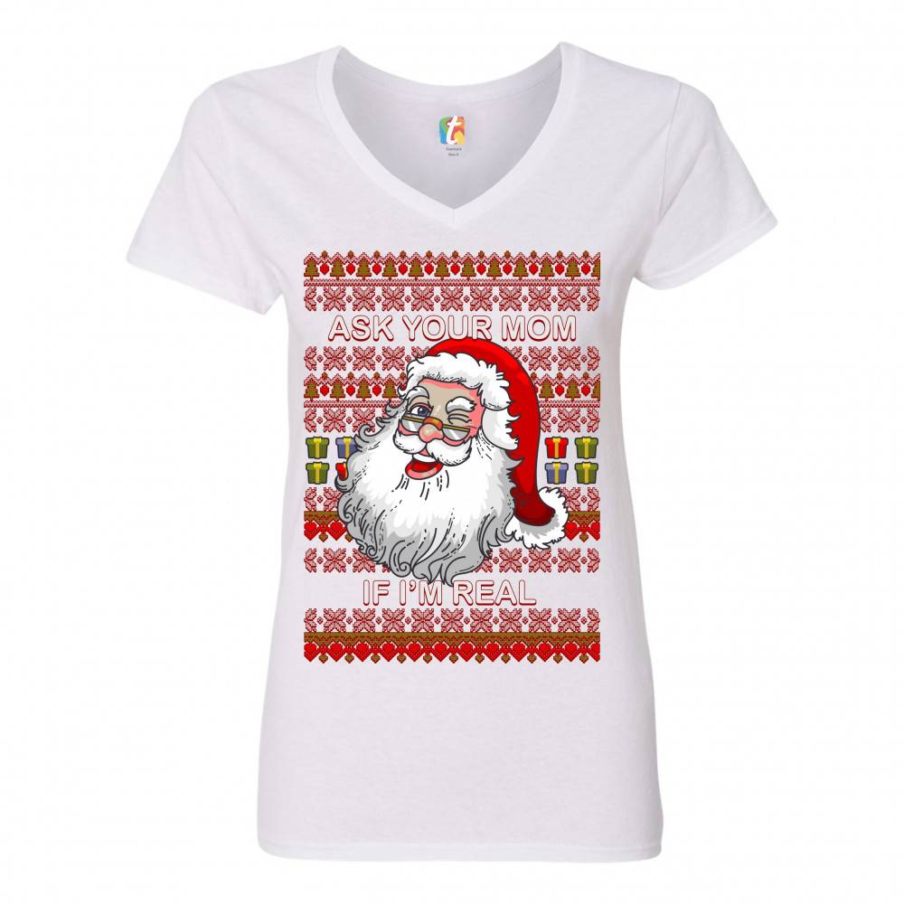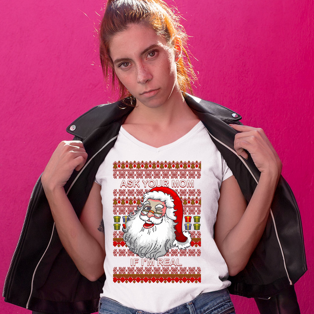 ASK YOUR MOM IF I'M REAL women's v-neck t-shirt ugly sweater christmas tee white