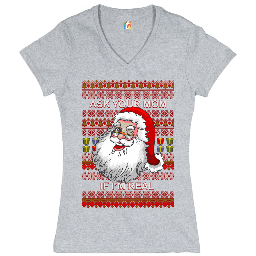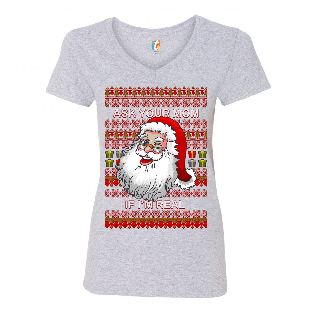 ASK YOUR MOM IF I'M REAL women's v-neck t-shirt ugly sweater christmas tee gray
