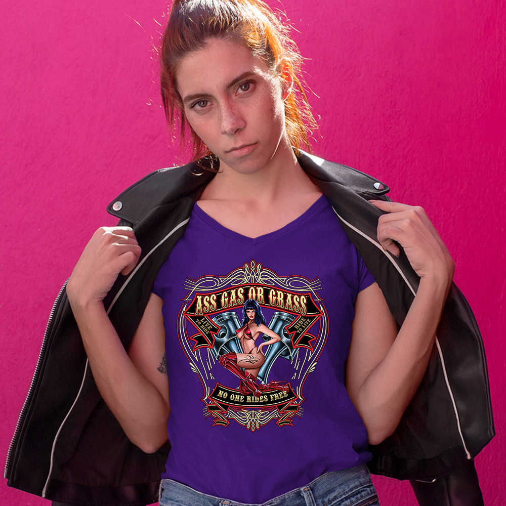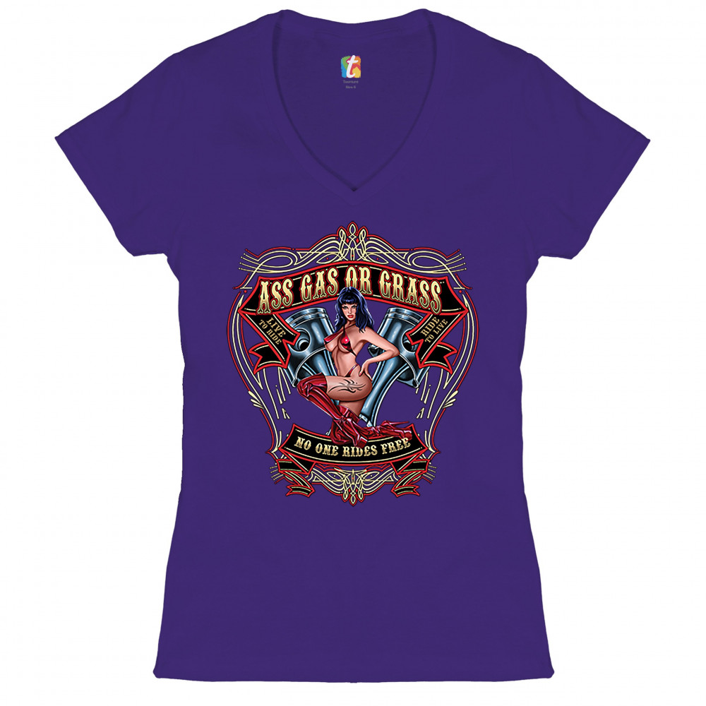 ASS GAS OR GRASS women's v-neck t-shirt biker no one rides free route 66 tee purple