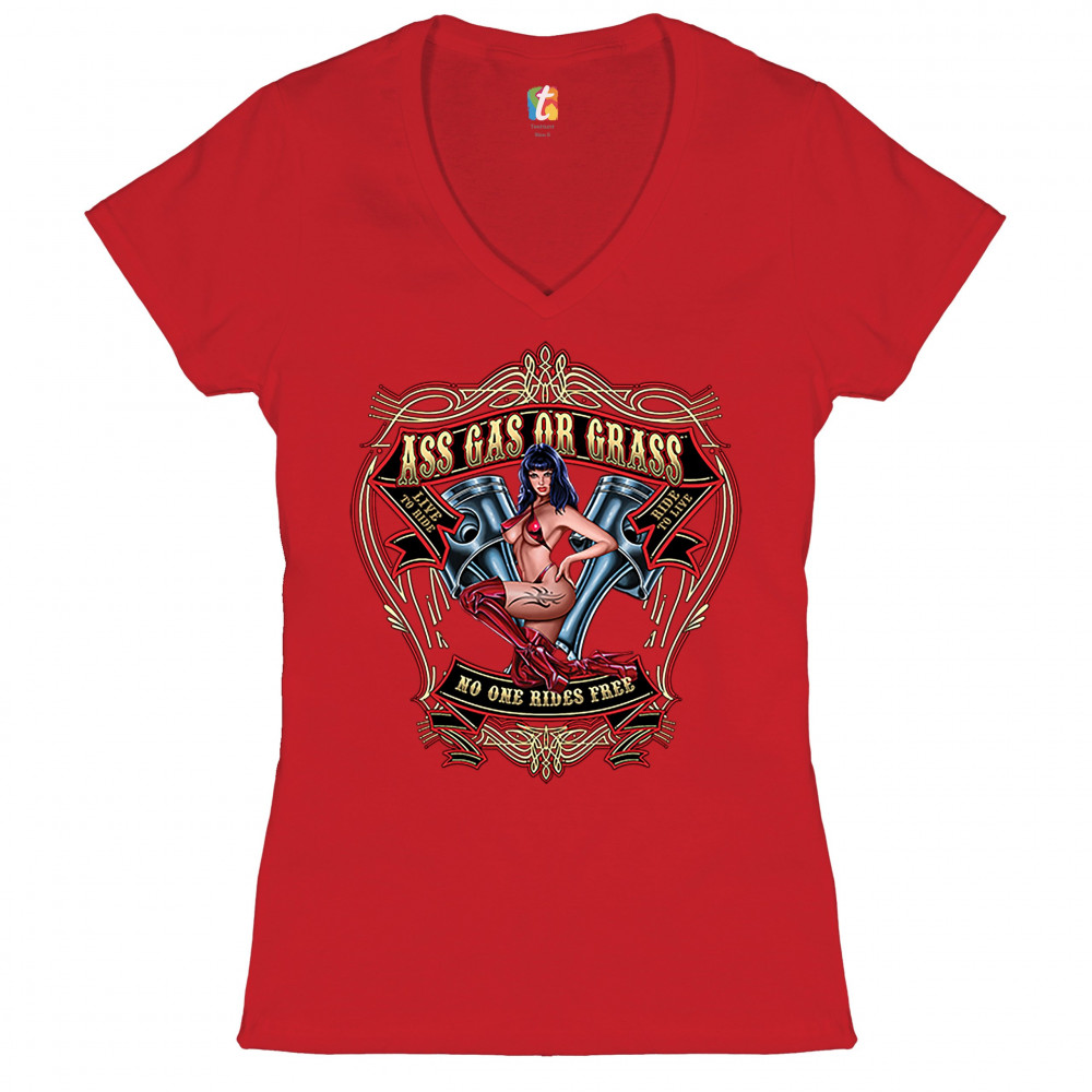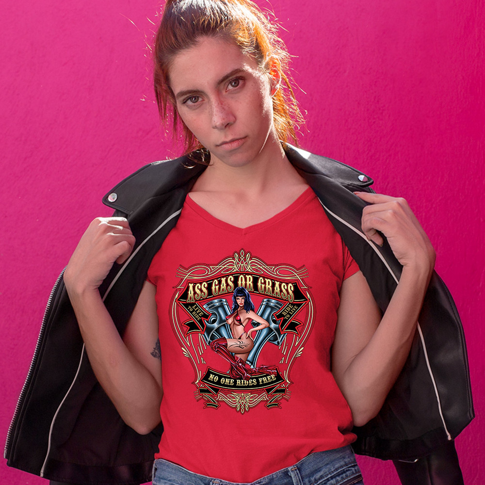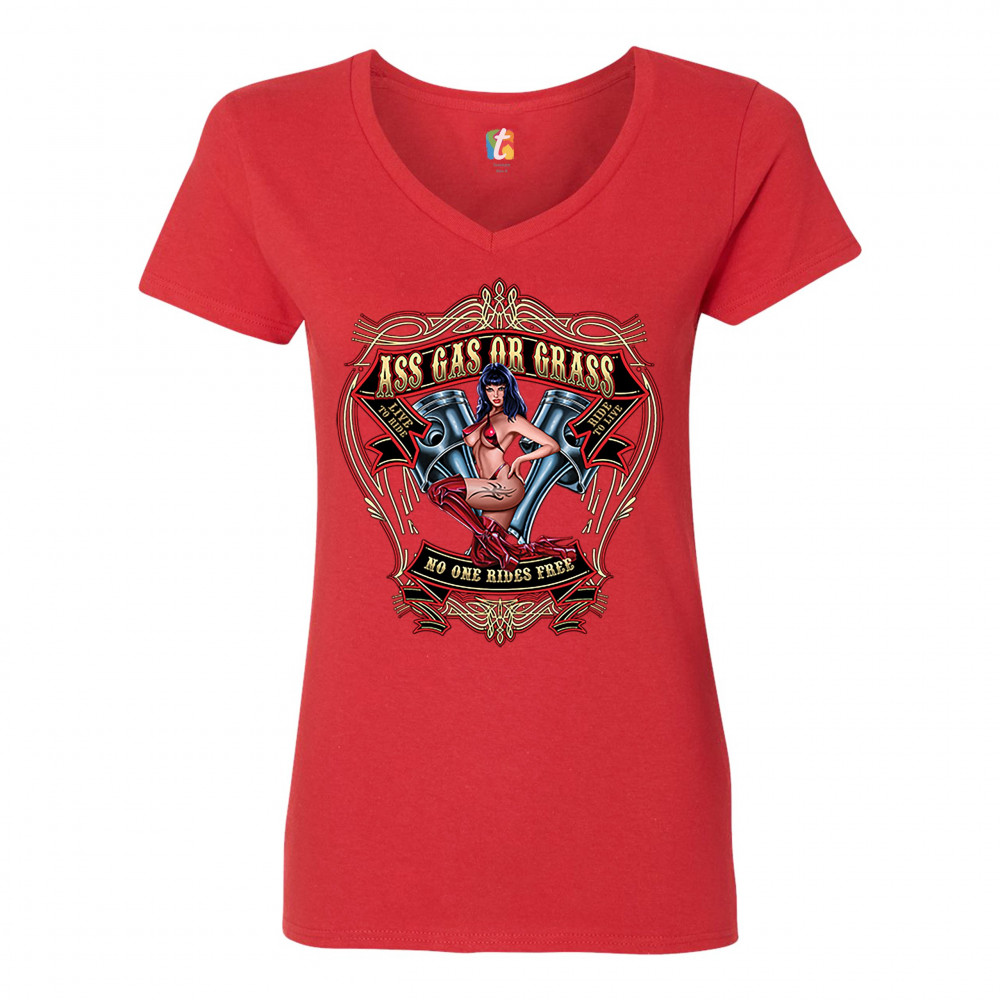 ASS GAS OR GRASS women's v-neck t-shirt biker no one rides free route 66 tee red