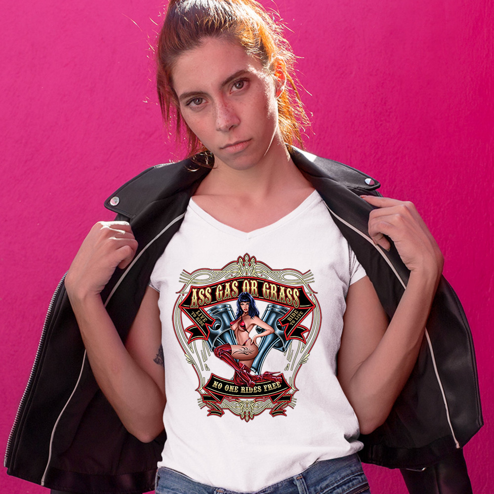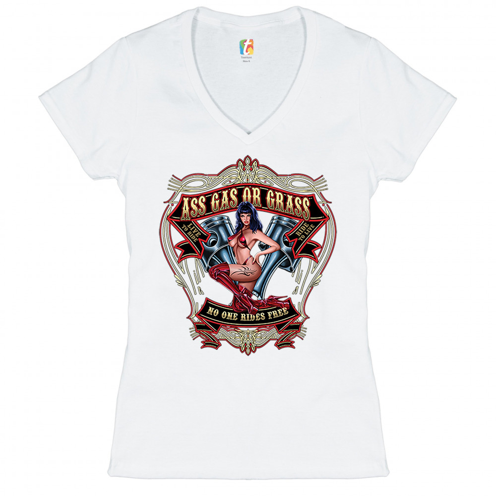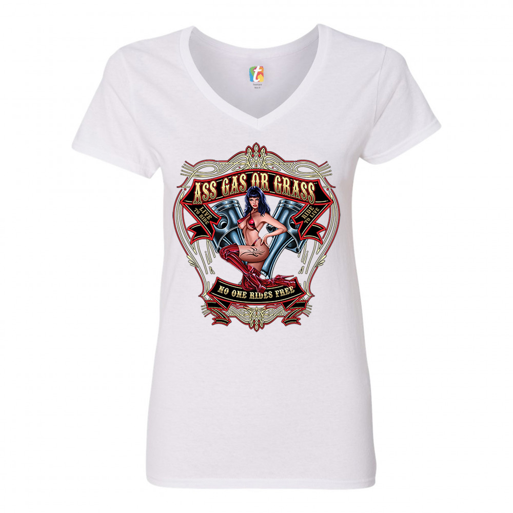 ASS GAS OR GRASS women's v-neck t-shirt biker no one rides free route 66 tee white