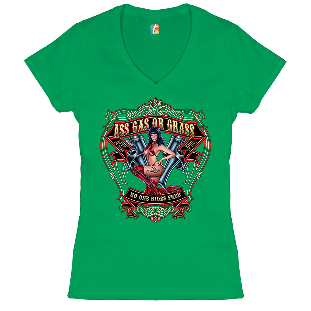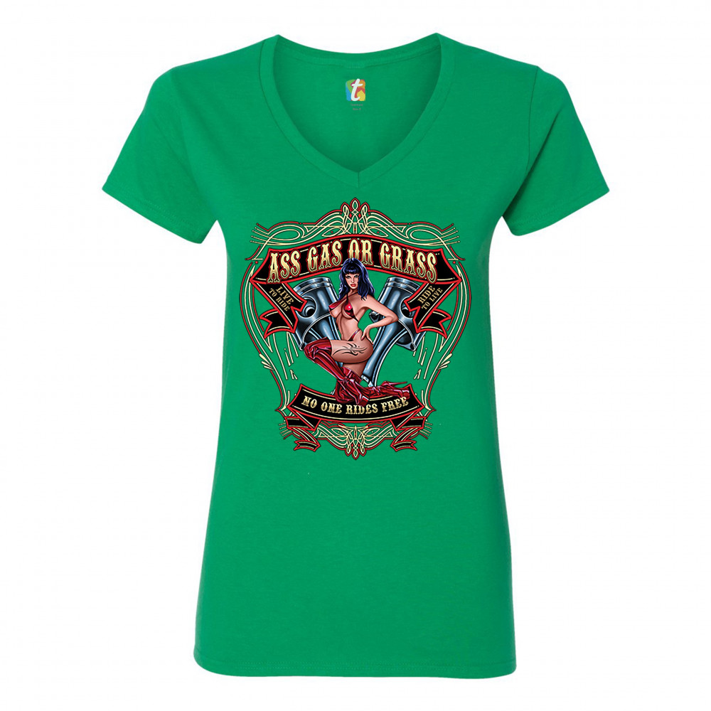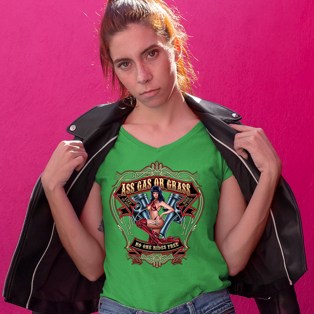 ASS GAS OR GRASS women's v-neck t-shirt biker no one rides free route 66 tee green