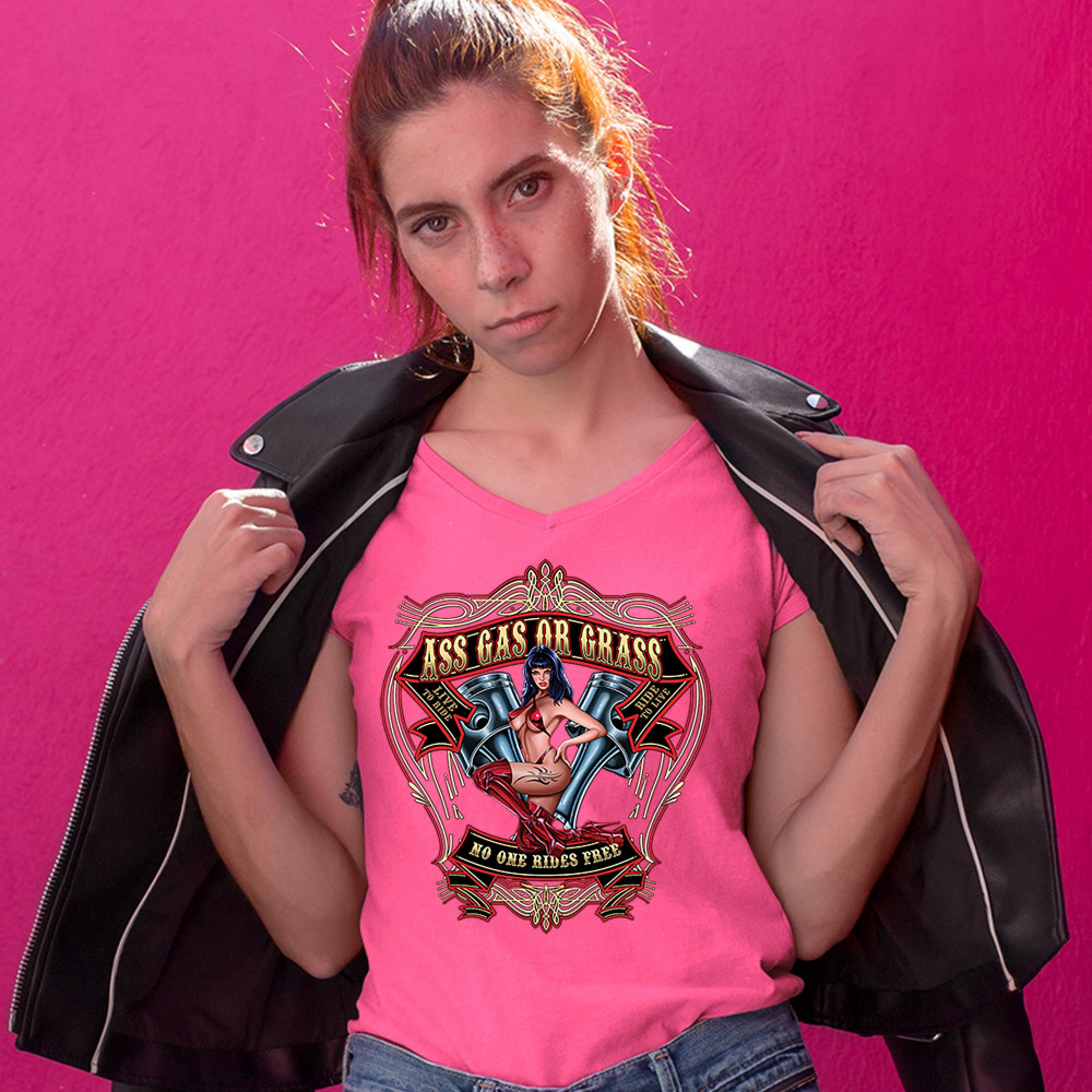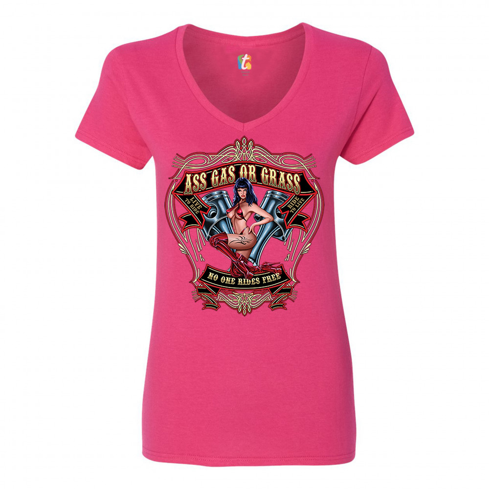 ASS GAS OR GRASS women's v-neck t-shirt biker no one rides free route 66 tee pink