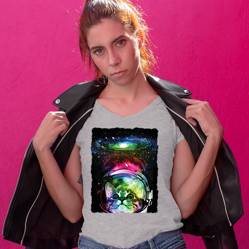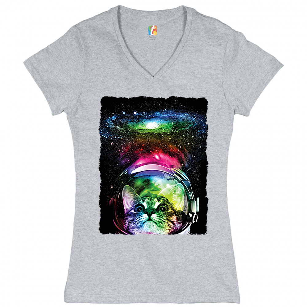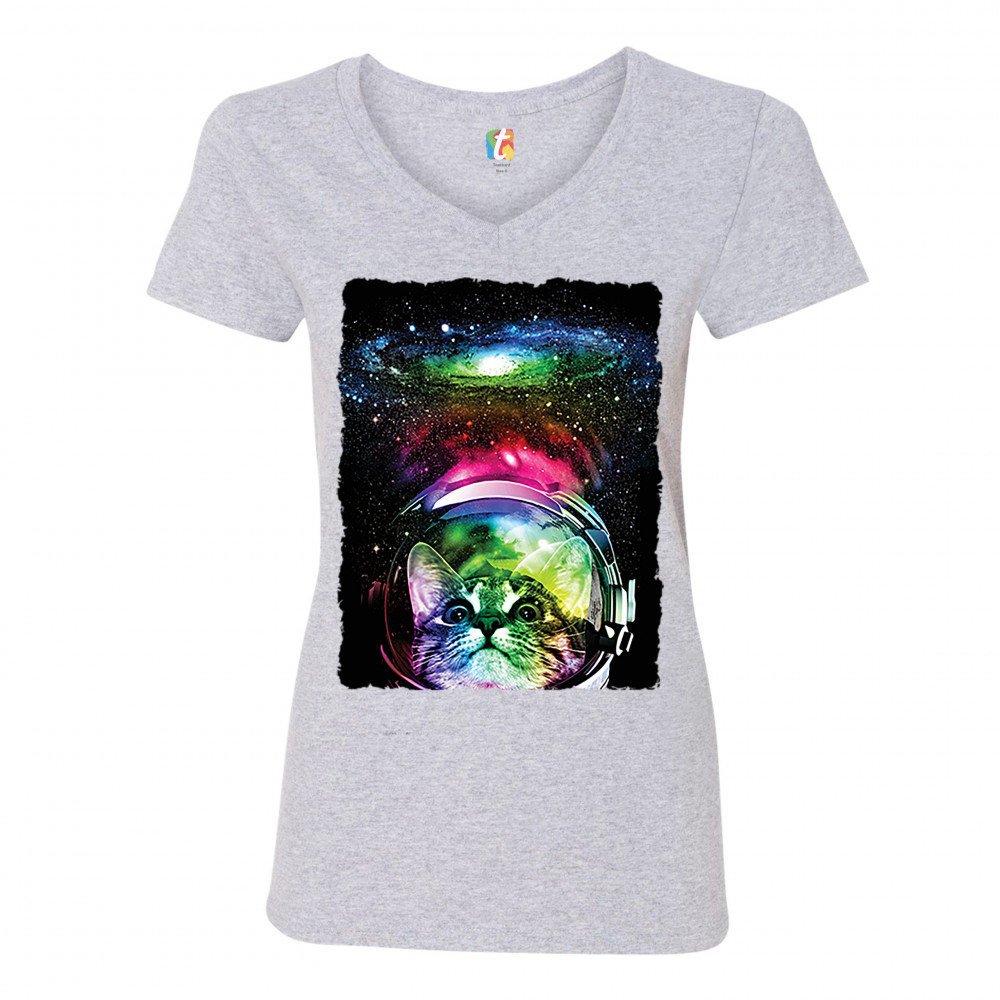 ASTRONAUT CAT women's v-neck t-shirt space kitty tee gray