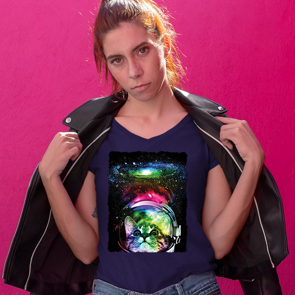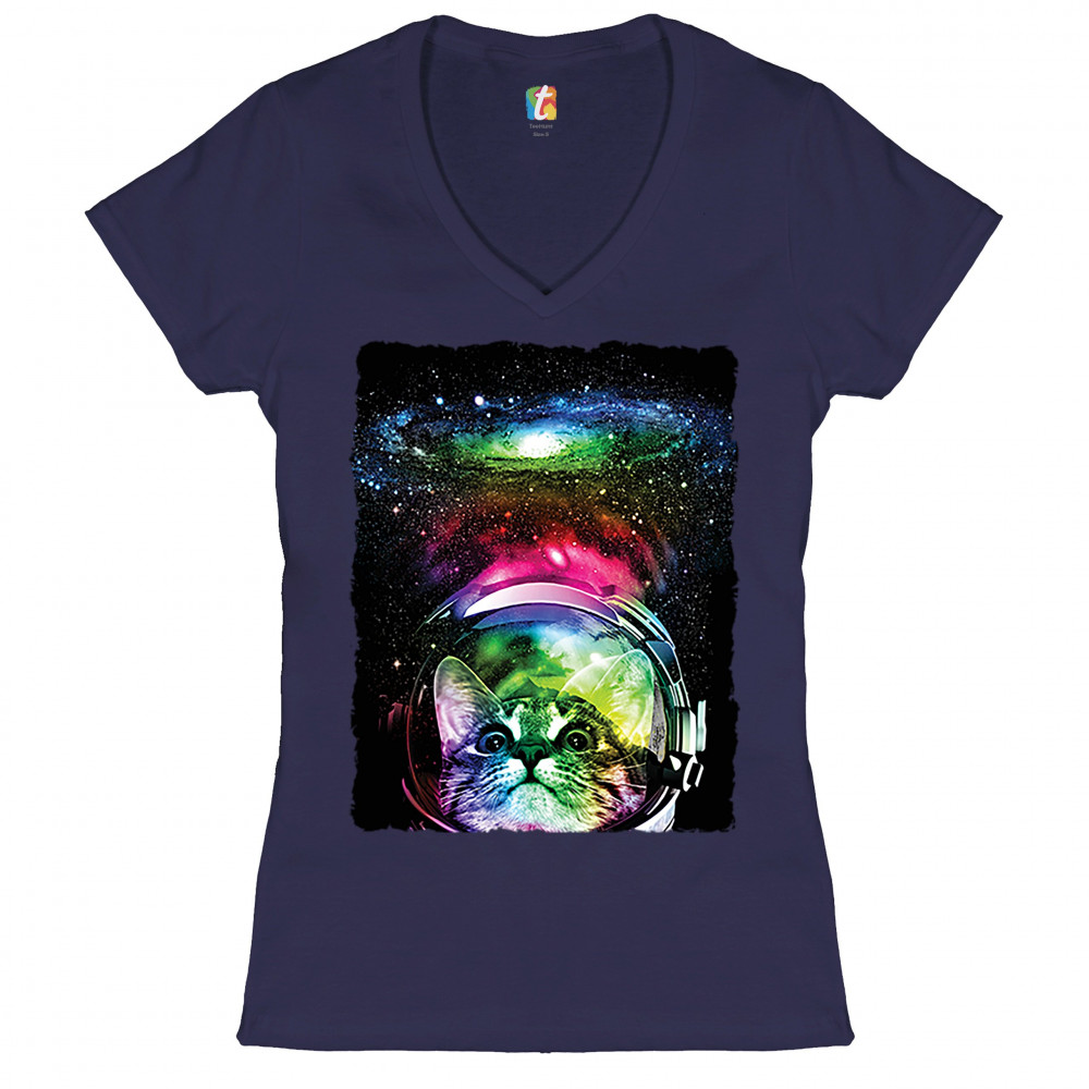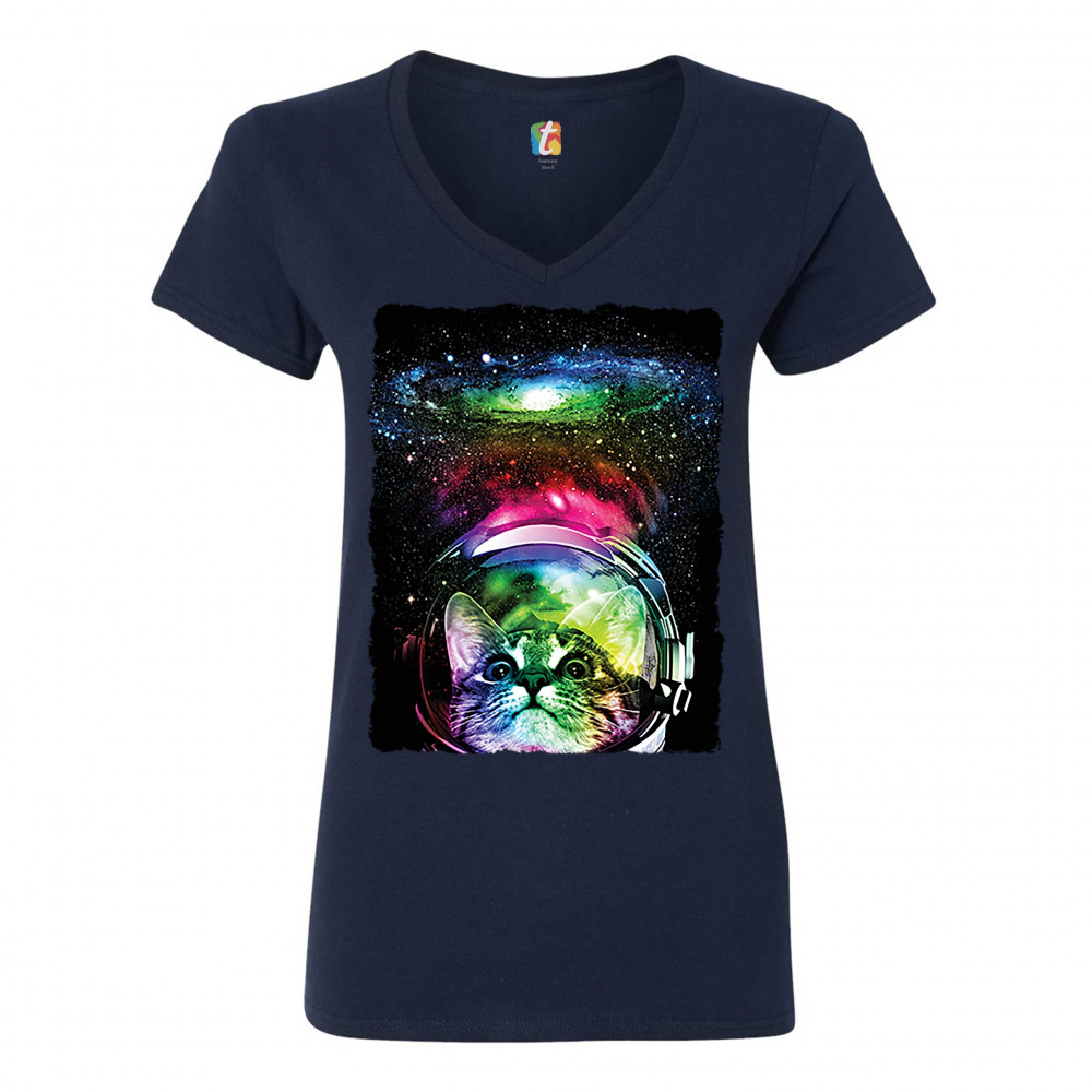 ASTRONAUT CAT women's v-neck t-shirt space kitty tee navy blue