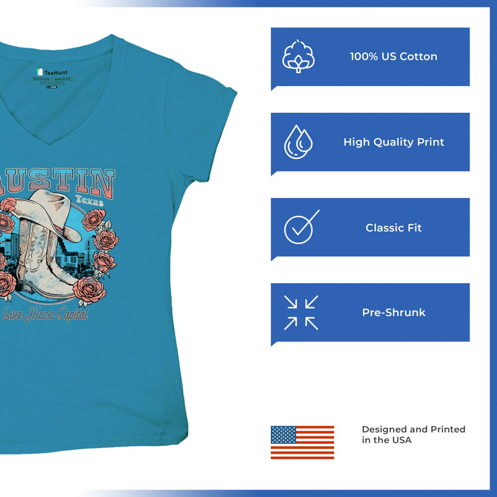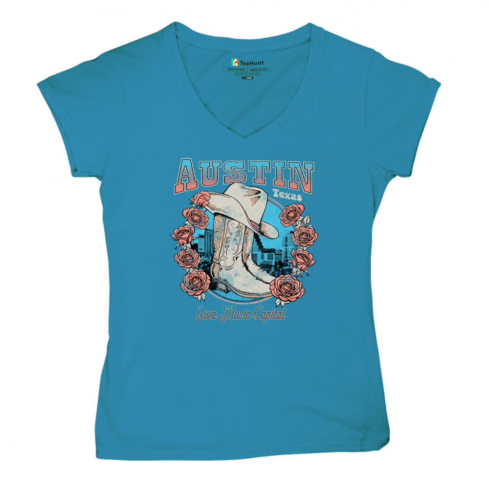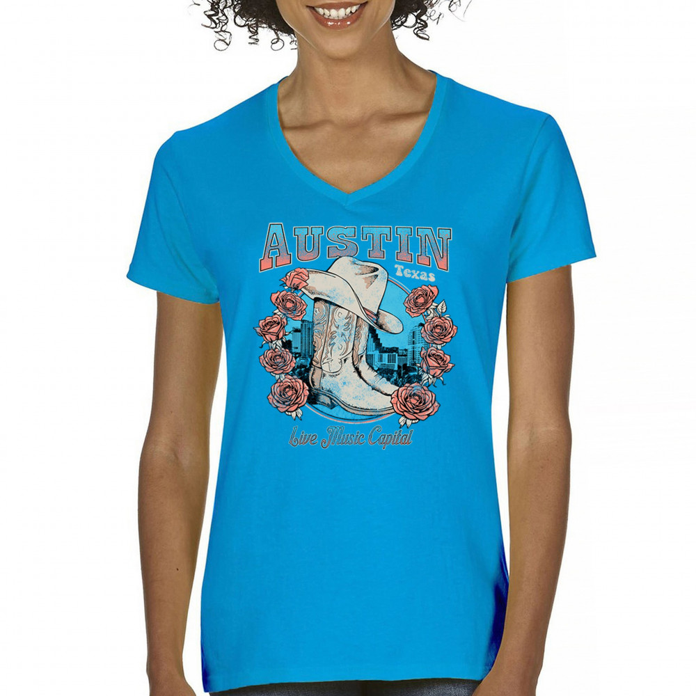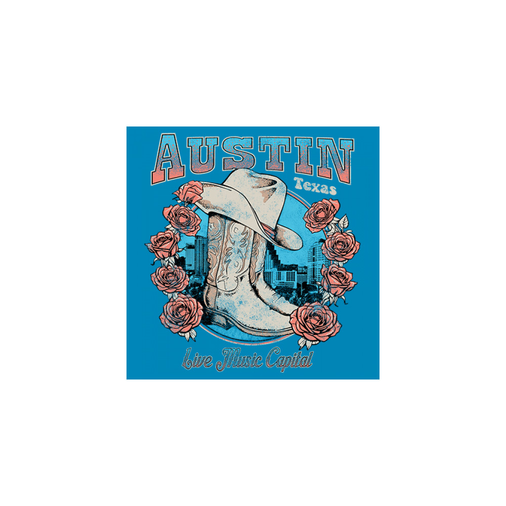 Austin TX Live Music Capital comes alive in this vintage cowgirl boots and hat design, accented by roses and the city skyline. Perfect for lovers of country music, honkytonk vibes, and western chic, this design embodies southern spirit, rustic grit, and the proud Americana aesthetic of Texas’ iconic music scene.