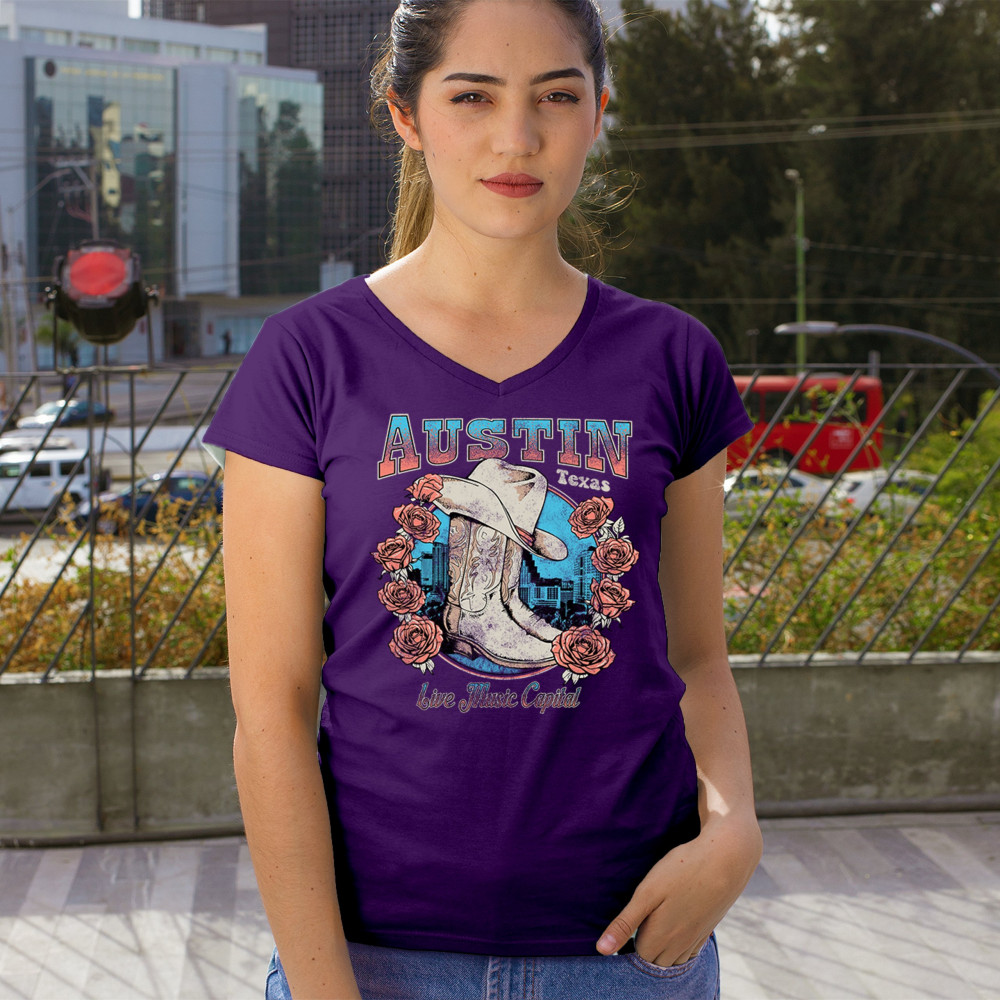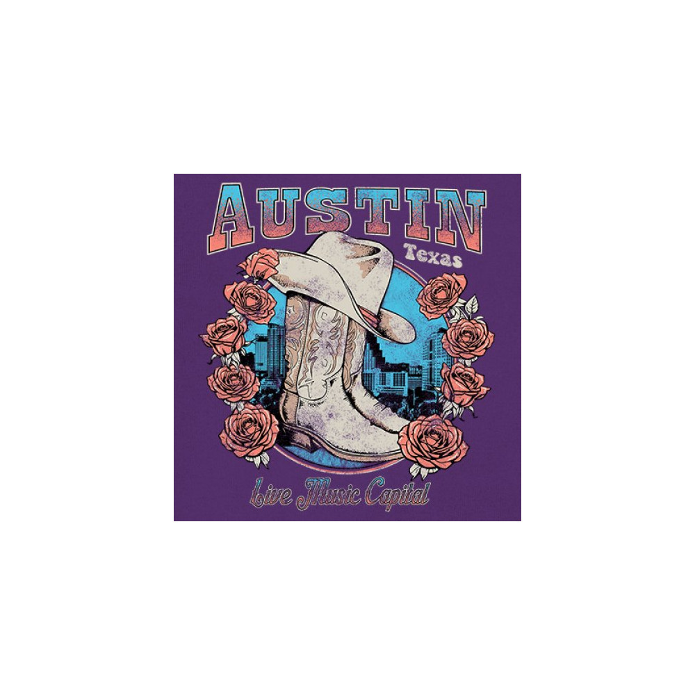Austin TX Live Music Capital comes alive in this vintage cowgirl boots and hat design, accented by roses and the city skyline. Perfect for lovers of country music, honkytonk vibes, and western chic, this design embodies southern spirit, rustic grit, and the proud Americana aesthetic of Texas’ iconic music scene.