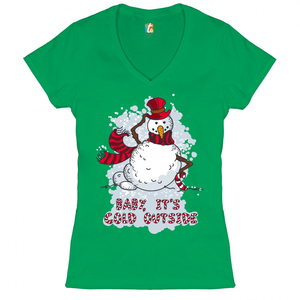 BABY, IT'S COLD OUTSIDE women's v-neck t-shirt merry christmas snowman tee green