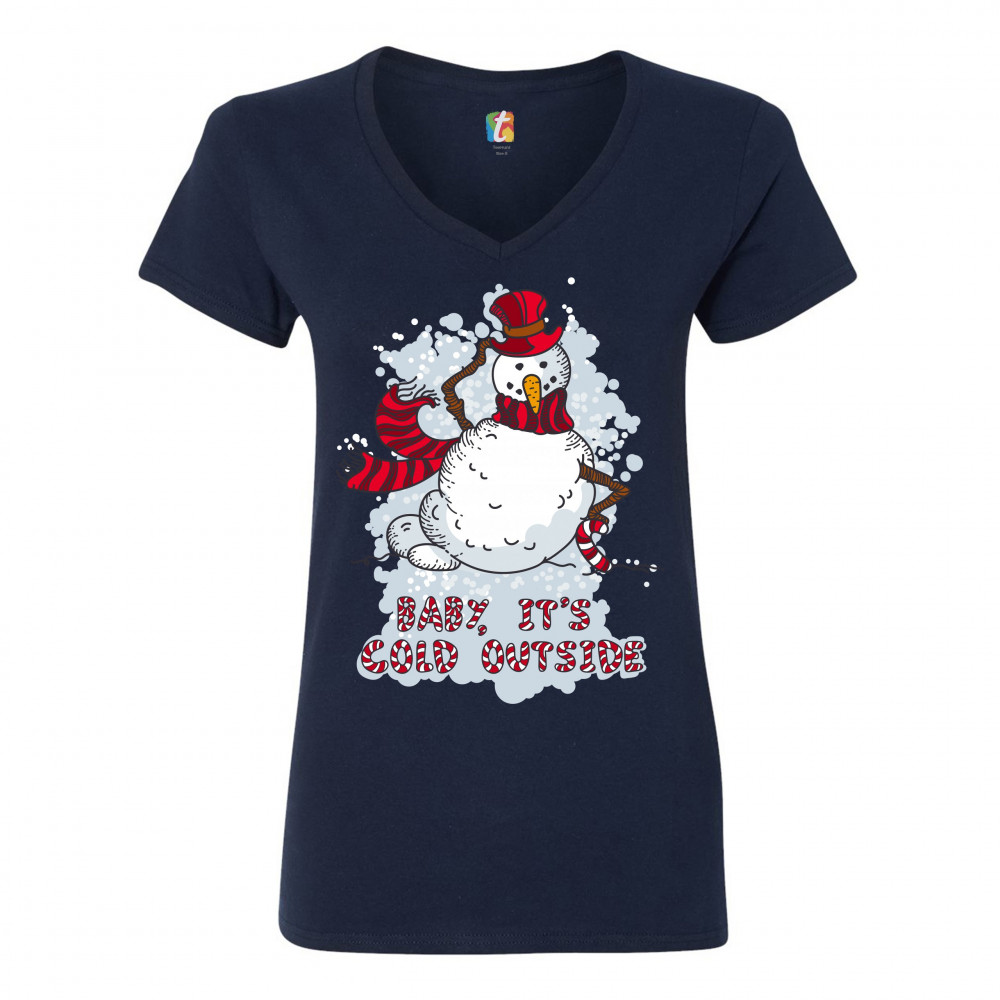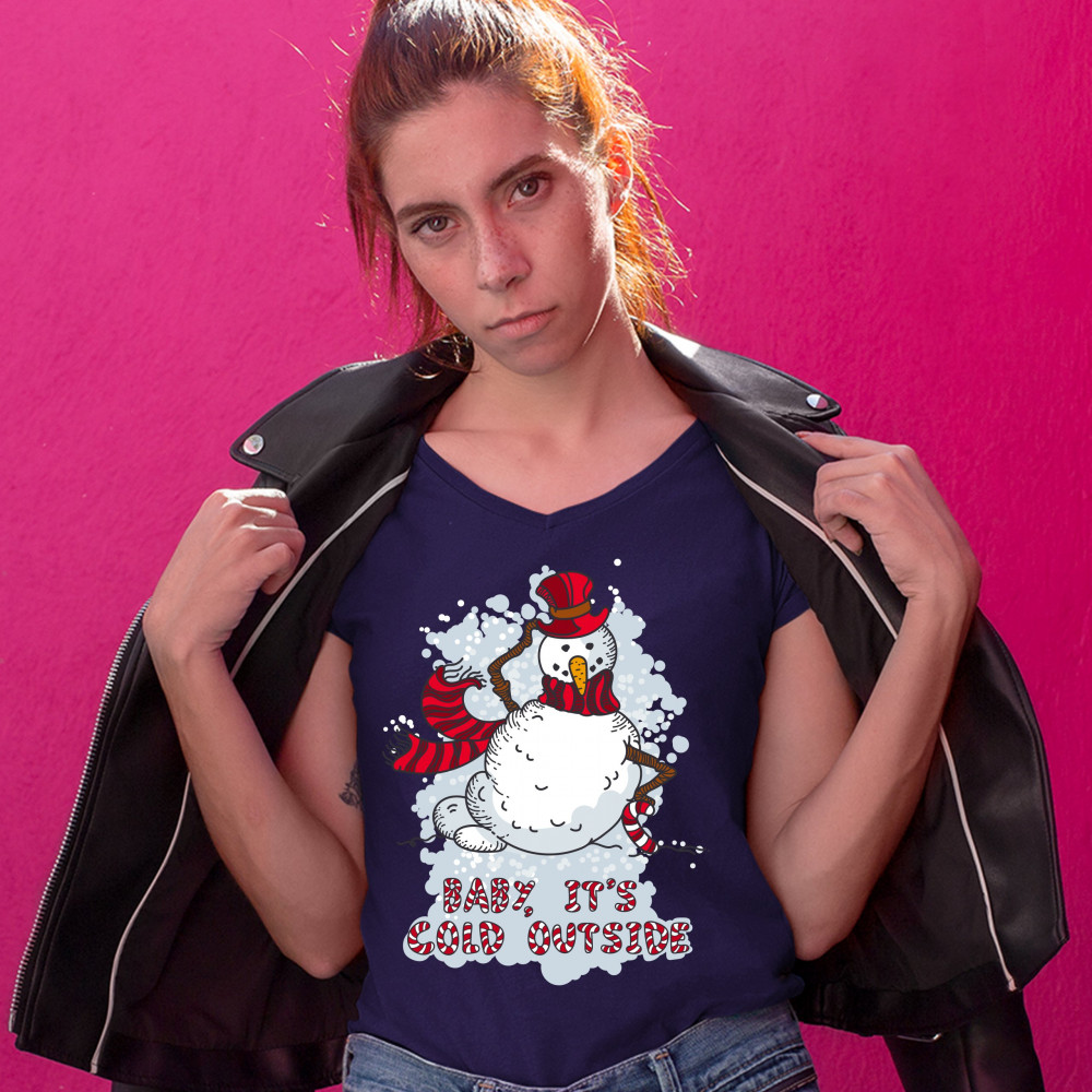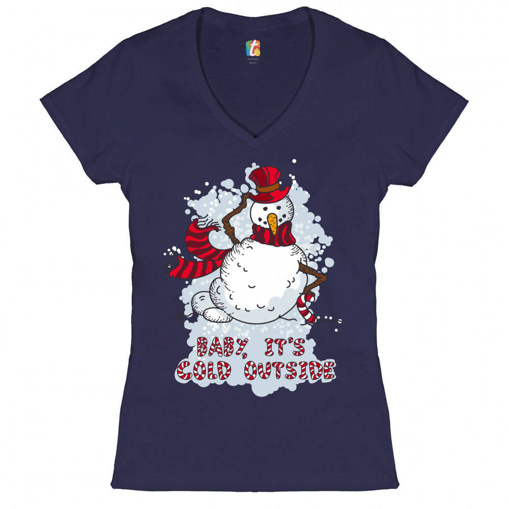 BABY, IT'S COLD OUTSIDE women's v-neck t-shirt merry christmas snowman tee navy blue