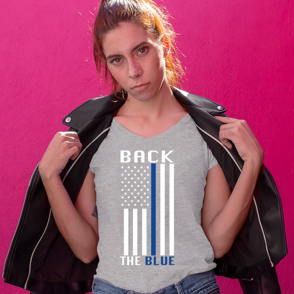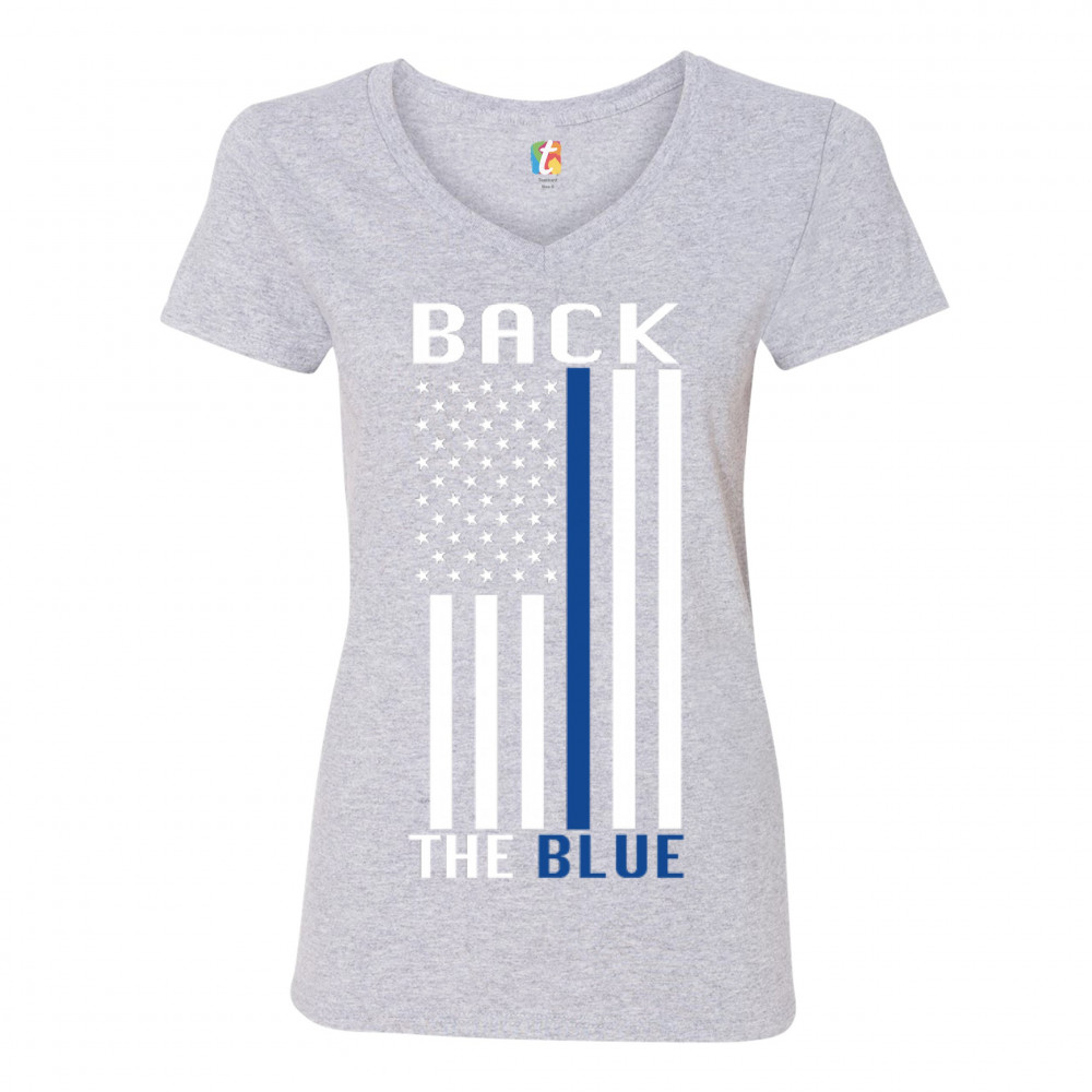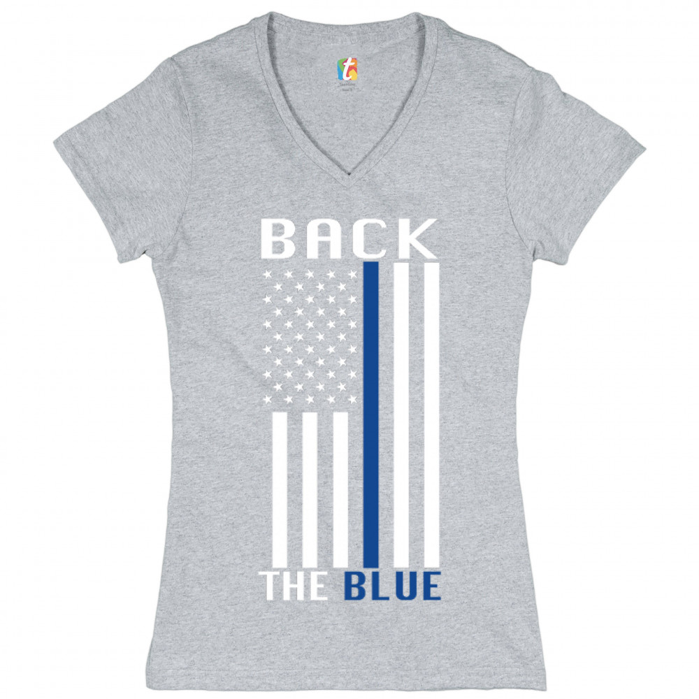 BACK THE BLUE AMERICAN FLAG women's v-neck t-shirt police law enforcement tee gray