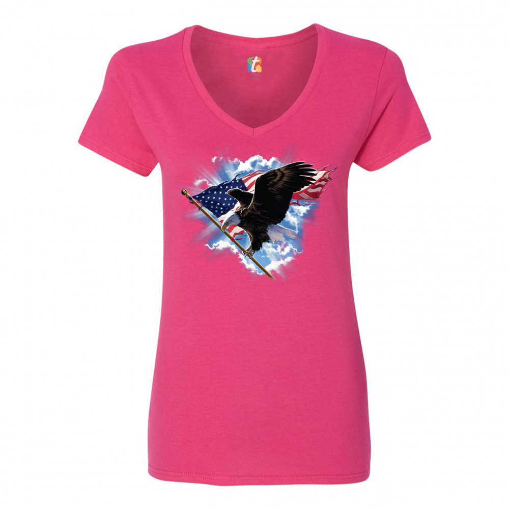 BALD EAGLE CARRYING THE AMERICAN FLAG women's v-neck t-shirt 4th of july tee pink