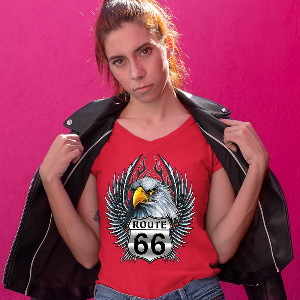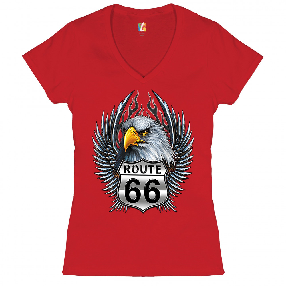 BALD EAGLE ROUTE 66 ROAD SIGN women's v-neck t-shirt live to ride biker mc tee red