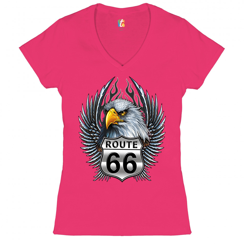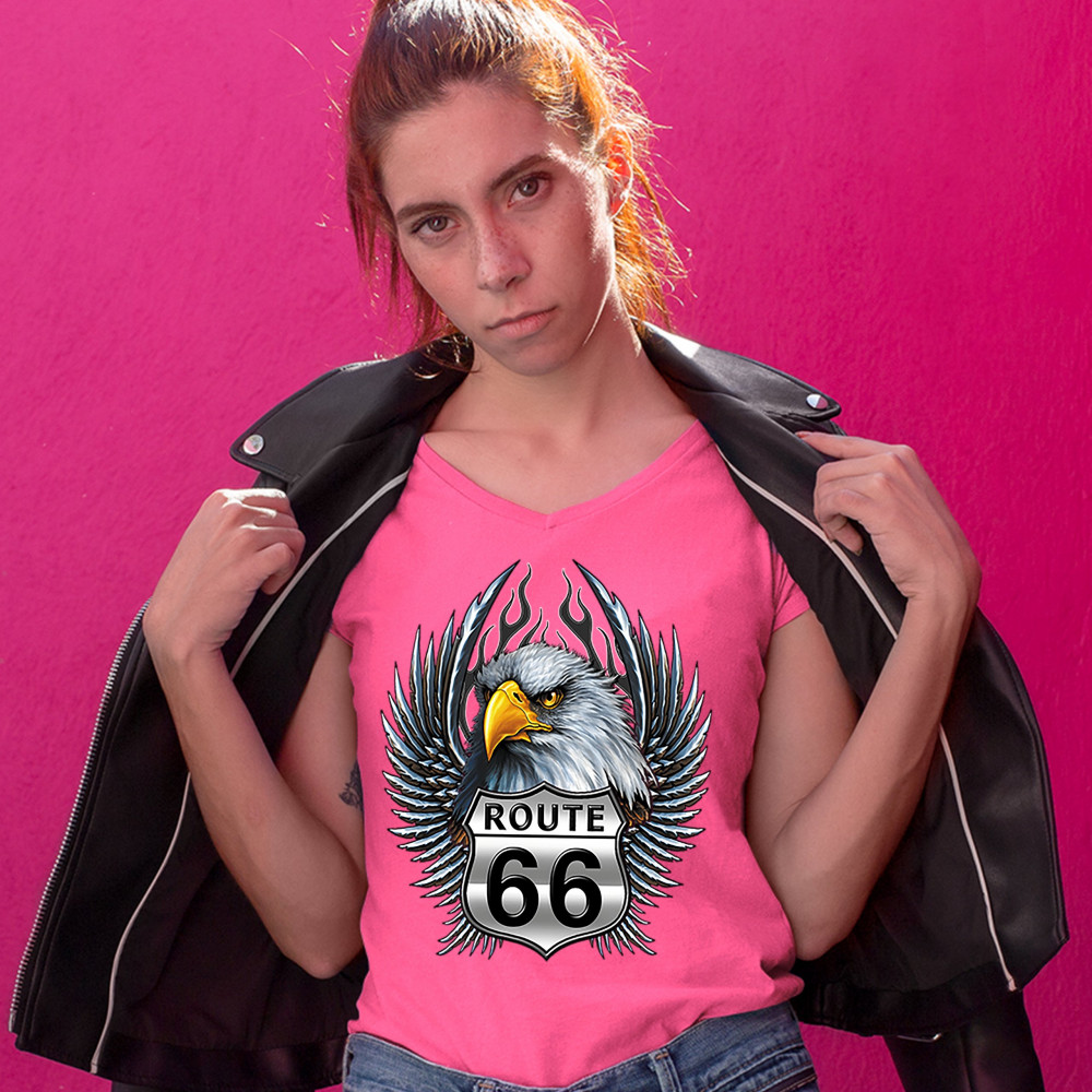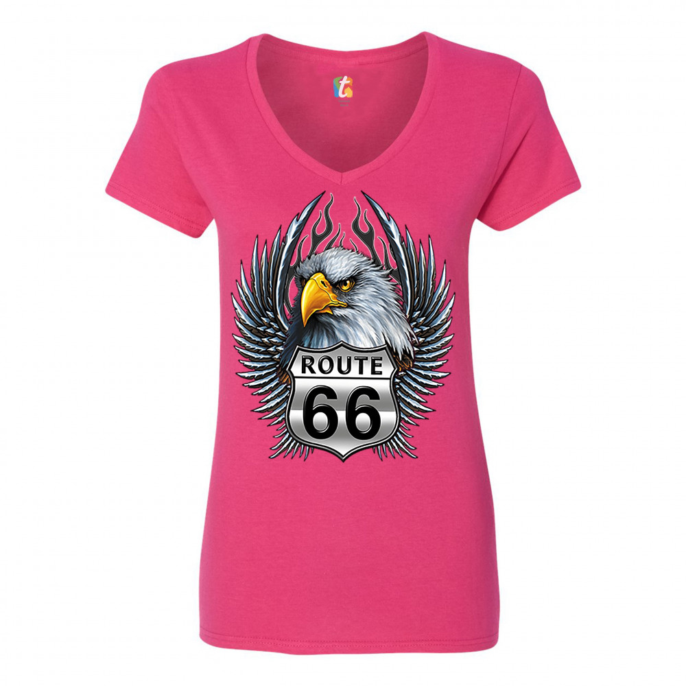 BALD EAGLE ROUTE 66 ROAD SIGN women's v-neck t-shirt live to ride biker mc tee pink