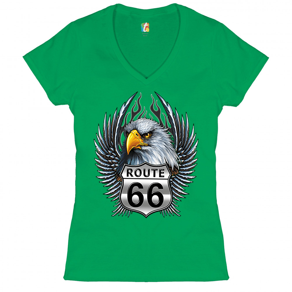 BALD EAGLE ROUTE 66 ROAD SIGN women's v-neck t-shirt live to ride biker mc tee green
