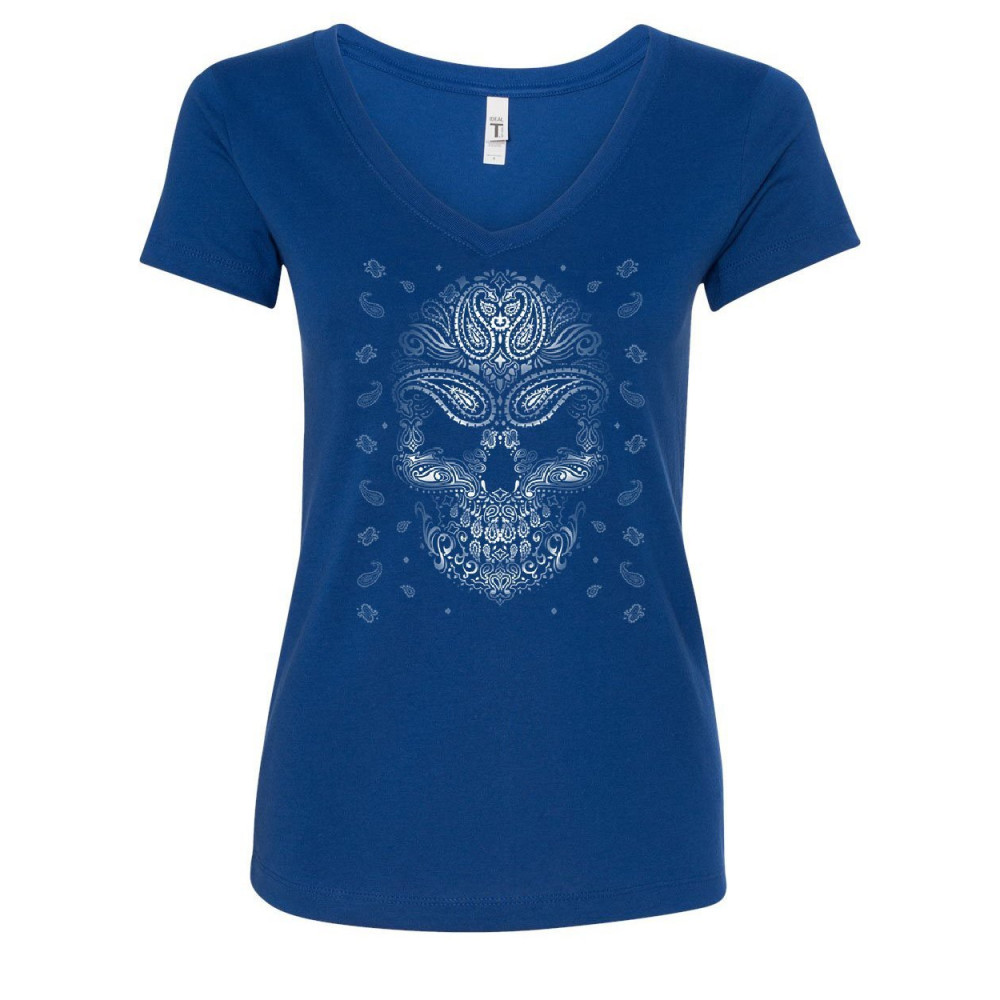 BANDANA SKULL FACE women's v-neck t-shirt gangsta badass swag urban skeleton royal blue