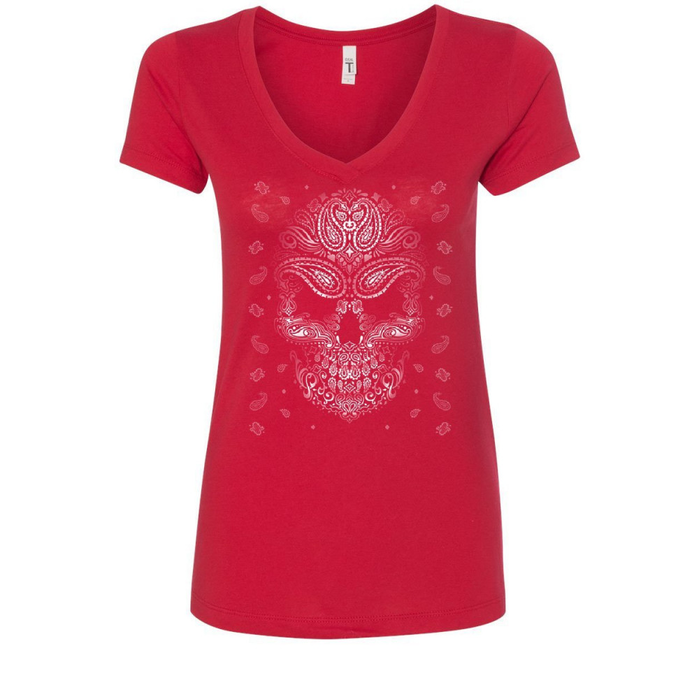 BANDANA SKULL FACE women's v-neck t-shirt gangsta badass swag urban skeleton red