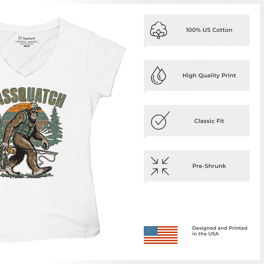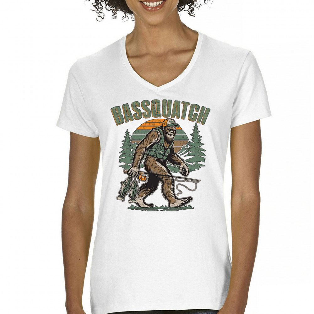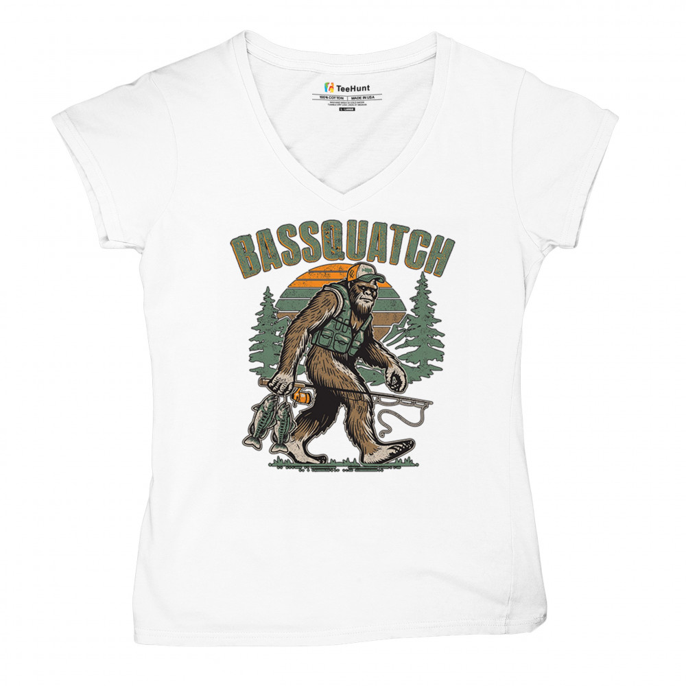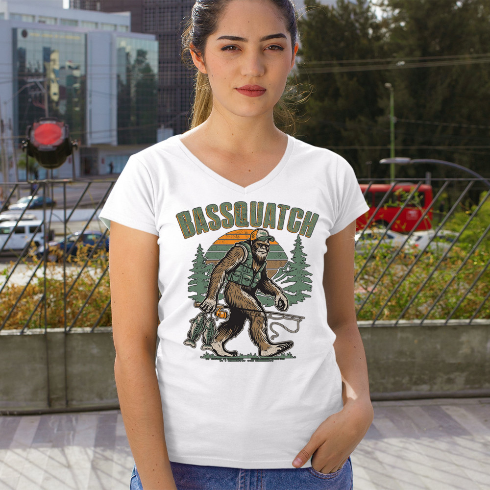Funny Bassquatch design blends Bigfoot, fishing humor, and retro forest style. Great for anglers, cryptid lovers, and outdoorsy pun fans.