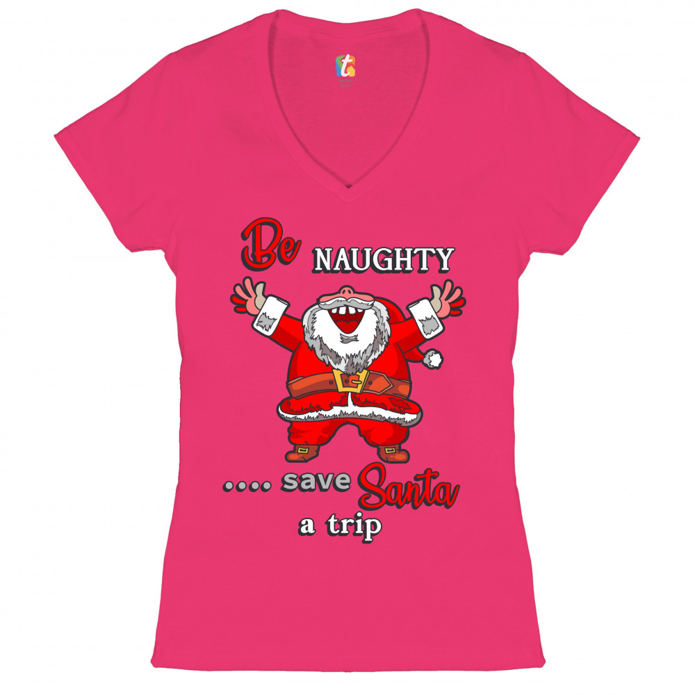 BE NAUGHTY SAVE SANTA A TRIP women's v-neck t-shirt christmas eve holiday tee pink