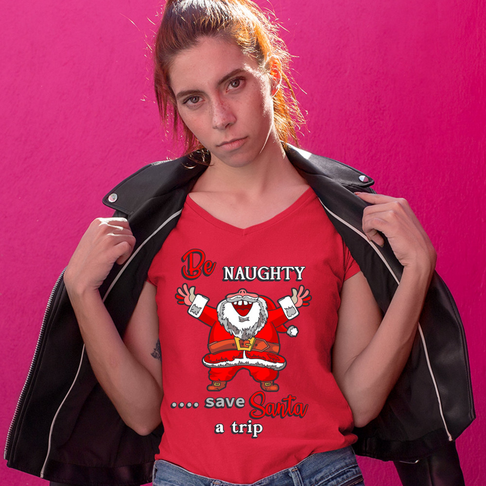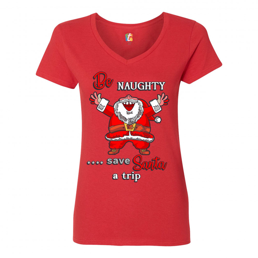 BE NAUGHTY SAVE SANTA A TRIP women's v-neck t-shirt christmas eve holiday tee red