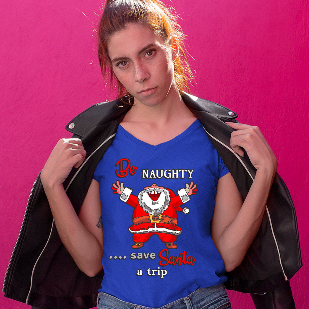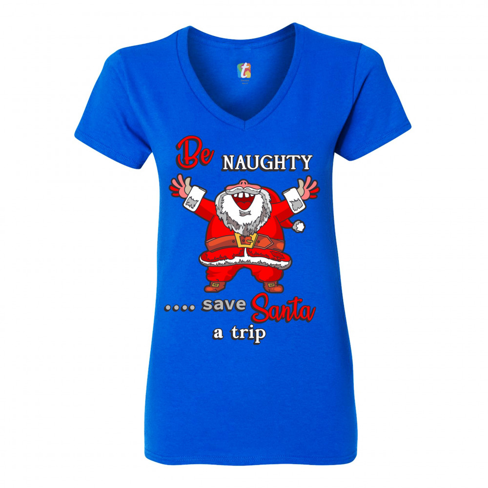 BE NAUGHTY SAVE SANTA A TRIP women's v-neck t-shirt christmas eve holiday tee royal blue
