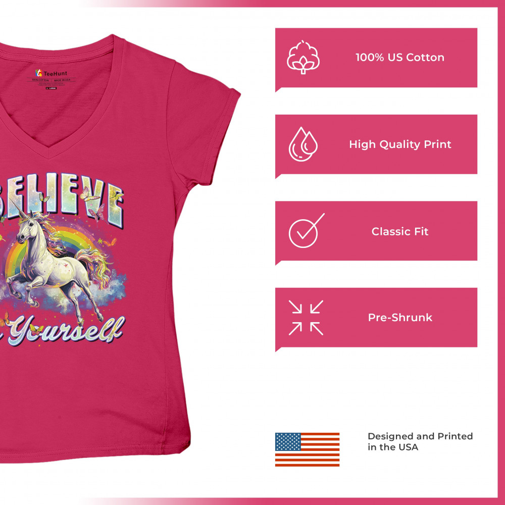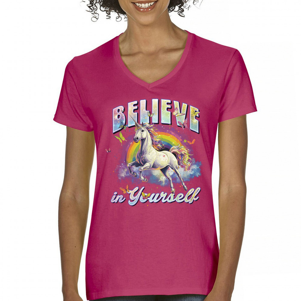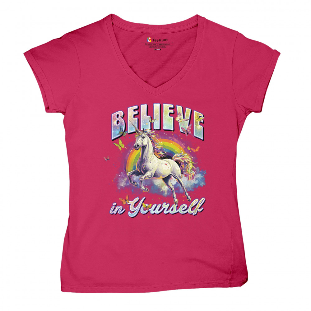 Believe in Yourself unicorn rainbow design with whimsical unicorn shirt, fantasy rainbow style, enchanted unicorn magic, galaxy sparkle, and positivity.