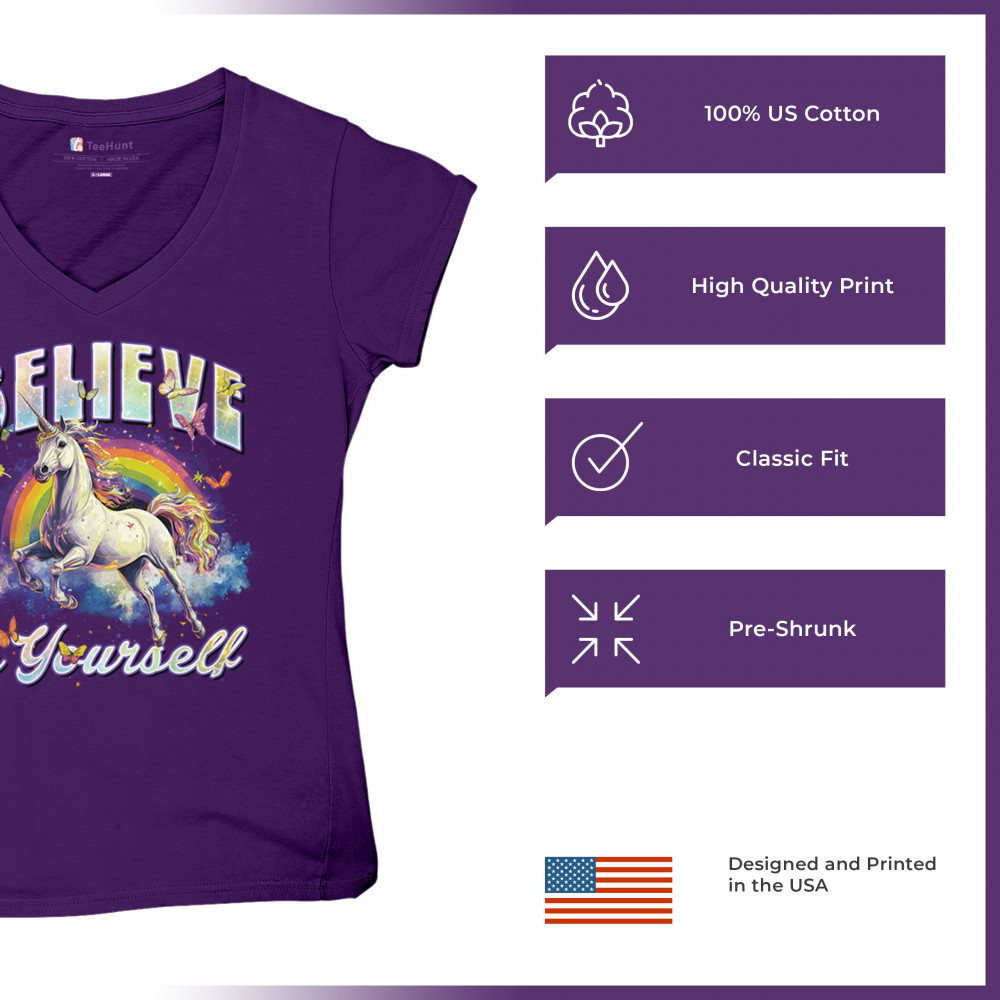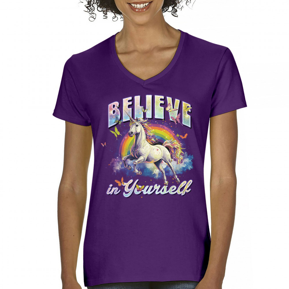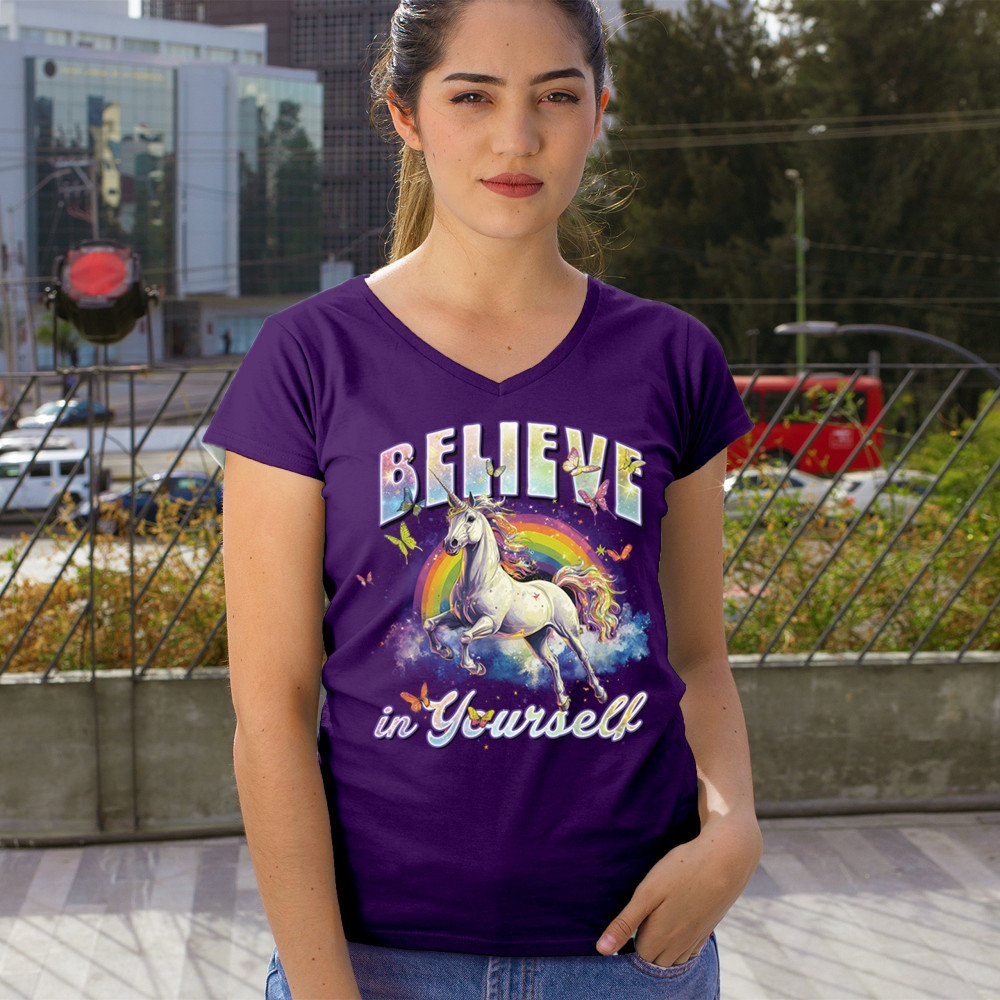 Believe in Yourself unicorn rainbow design with whimsical unicorn shirt, fantasy rainbow style, enchanted unicorn magic, galaxy sparkle, and positivity.