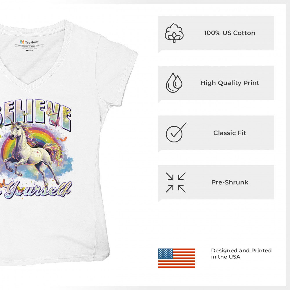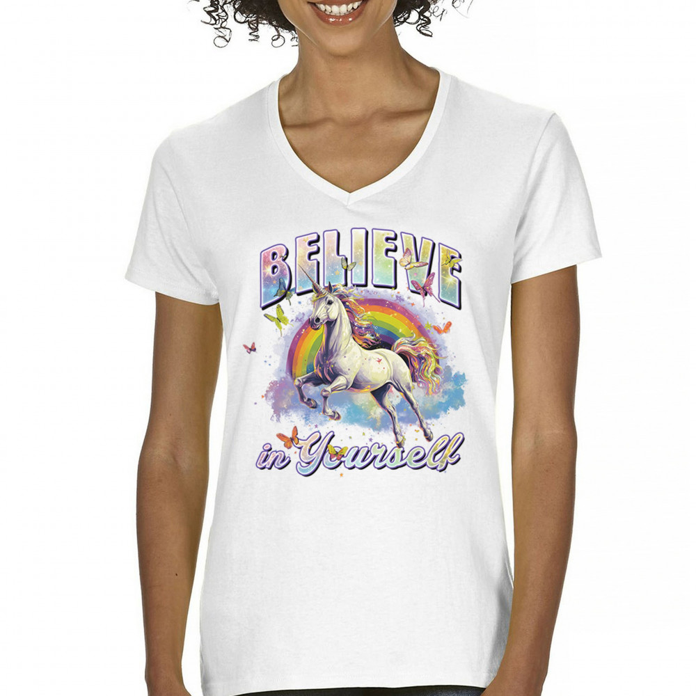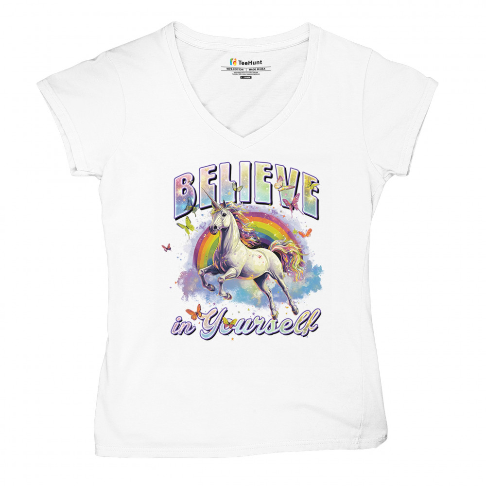 Believe in Yourself unicorn rainbow design with whimsical unicorn shirt, fantasy rainbow style, enchanted unicorn magic, galaxy sparkle, and positivity.