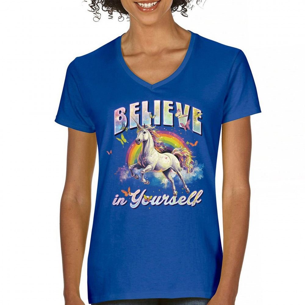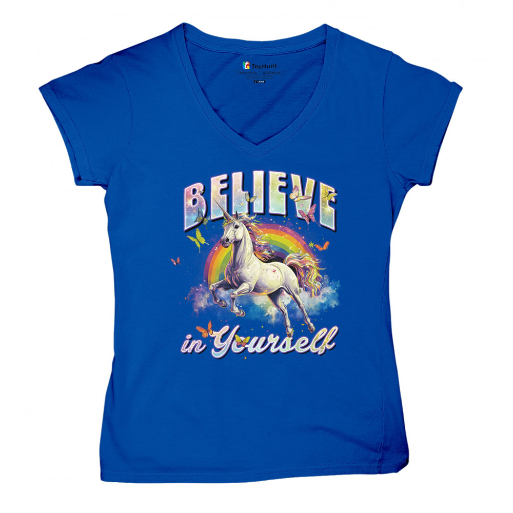 Believe in Yourself unicorn rainbow design with whimsical unicorn shirt, fantasy rainbow style, enchanted unicorn magic, galaxy sparkle, and positivity.