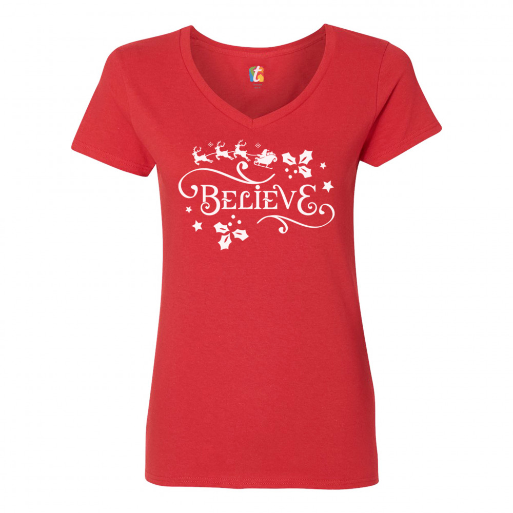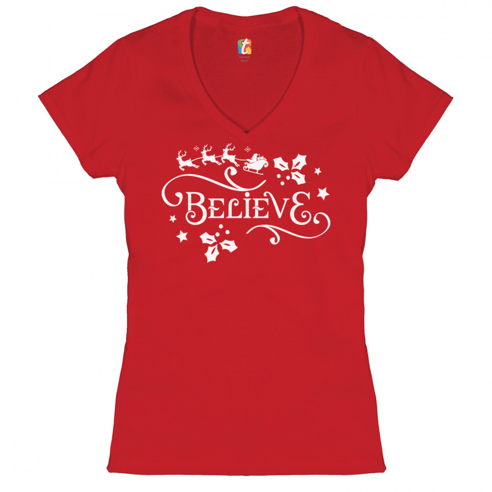 BELIEVE women's v-neck t-shirt merry christmas santa rudolph mistletoe tee red