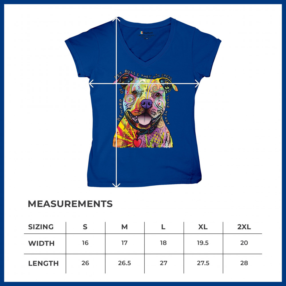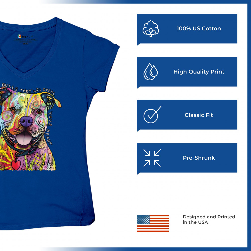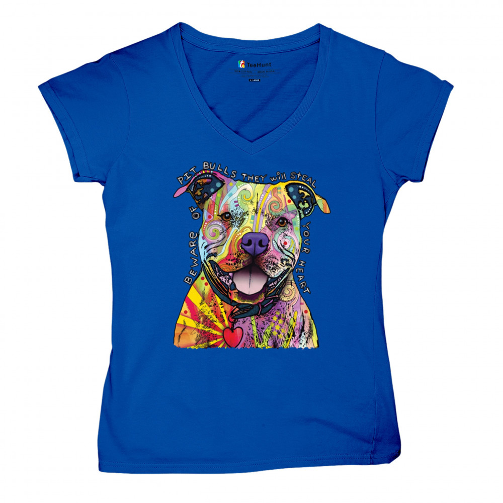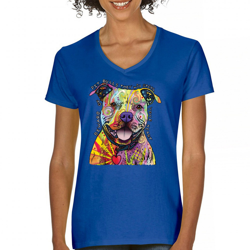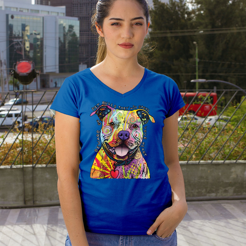 BEWARE OF PIT BULLS women's v-neck t-shirt dean russo art colorful cute dog tee royal blue