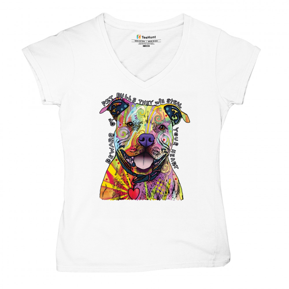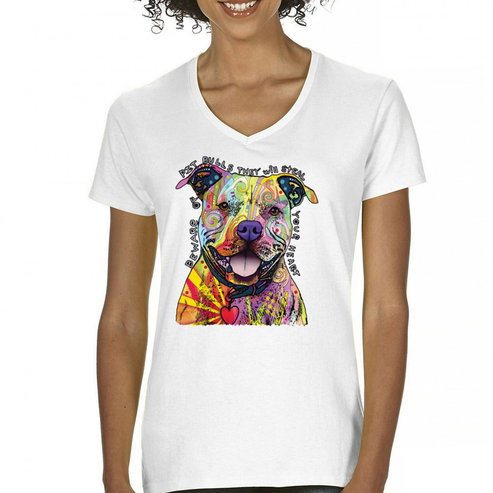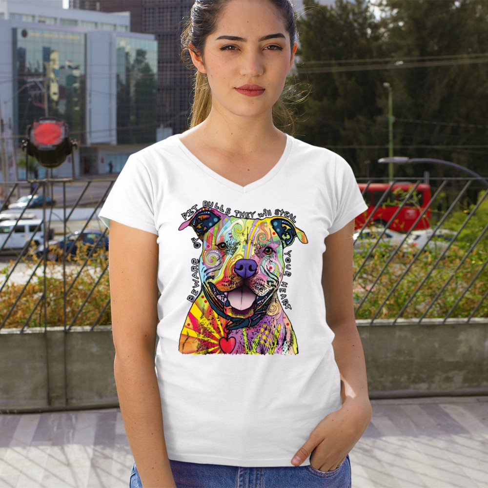 BEWARE OF PIT BULLS women's v-neck t-shirt dean russo art colorful cute dog tee white
