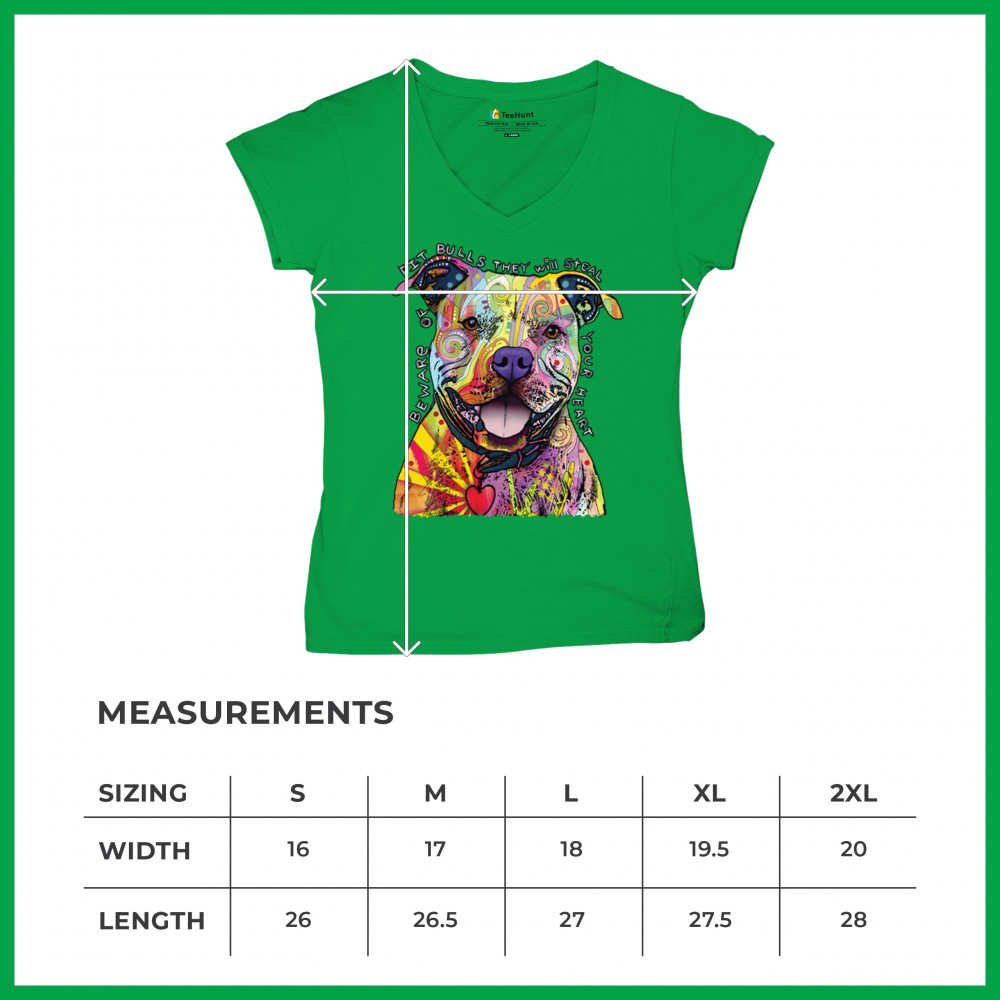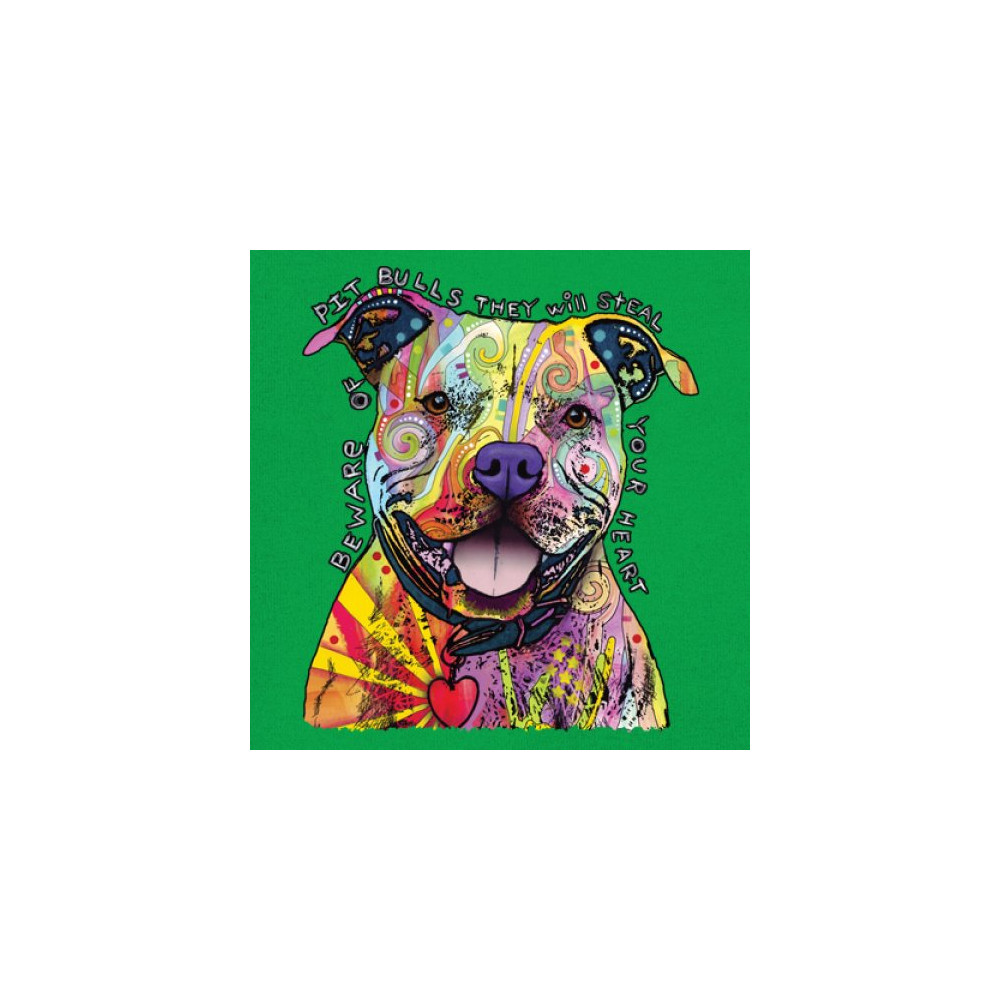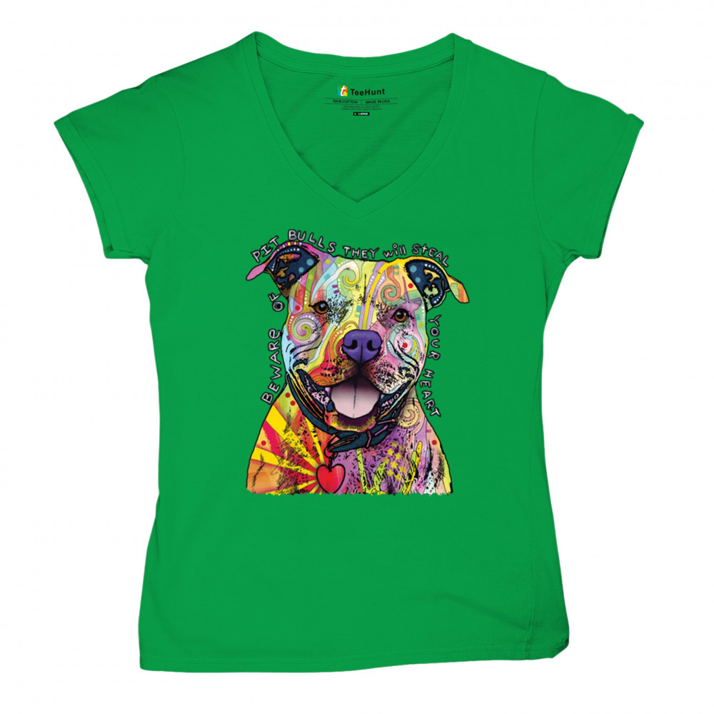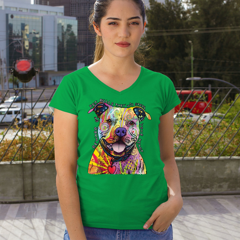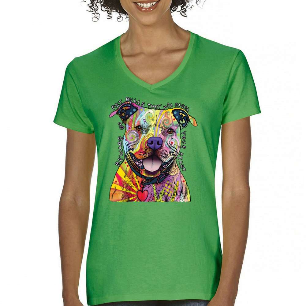 BEWARE OF PIT BULLS women's v-neck t-shirt dean russo art colorful cute dog tee green