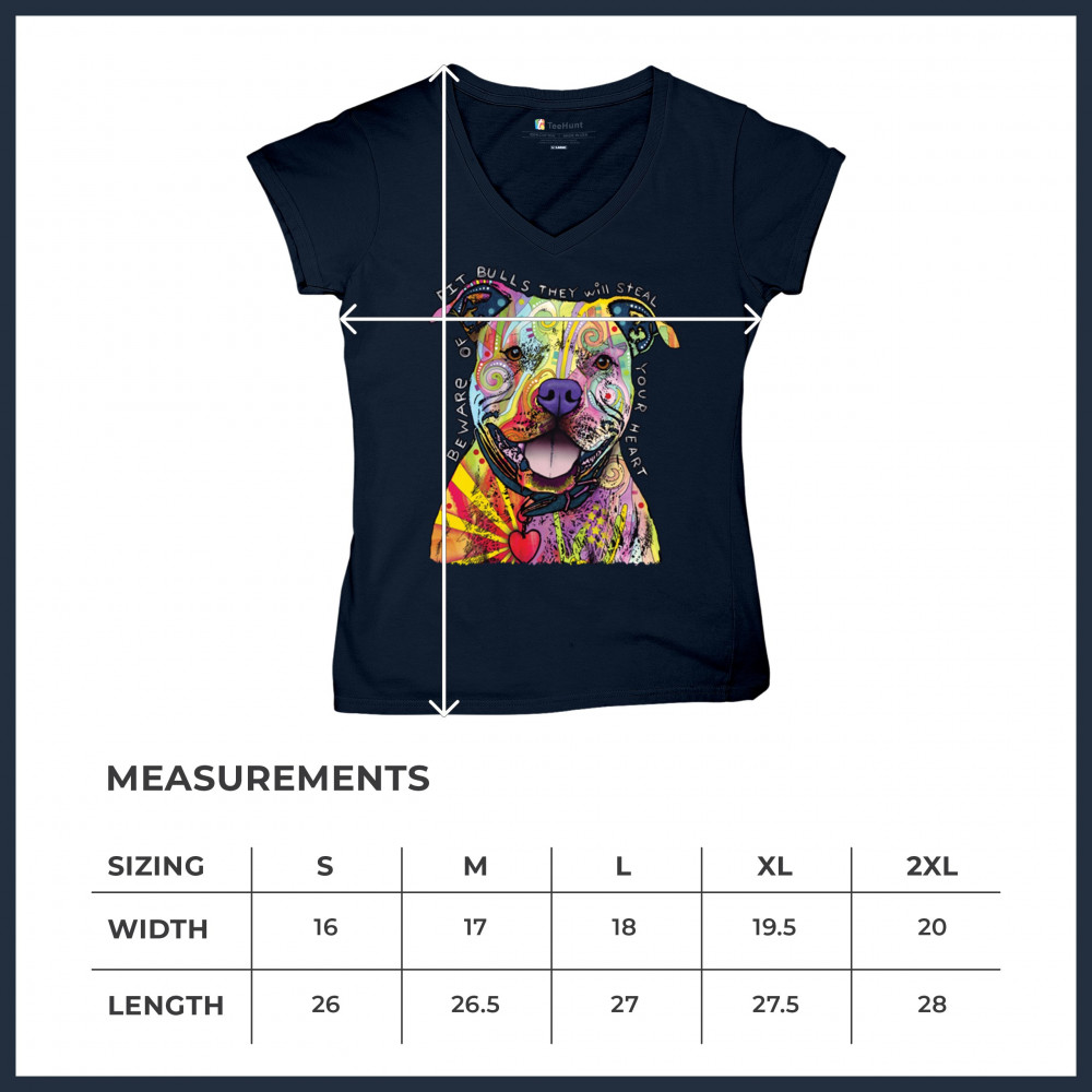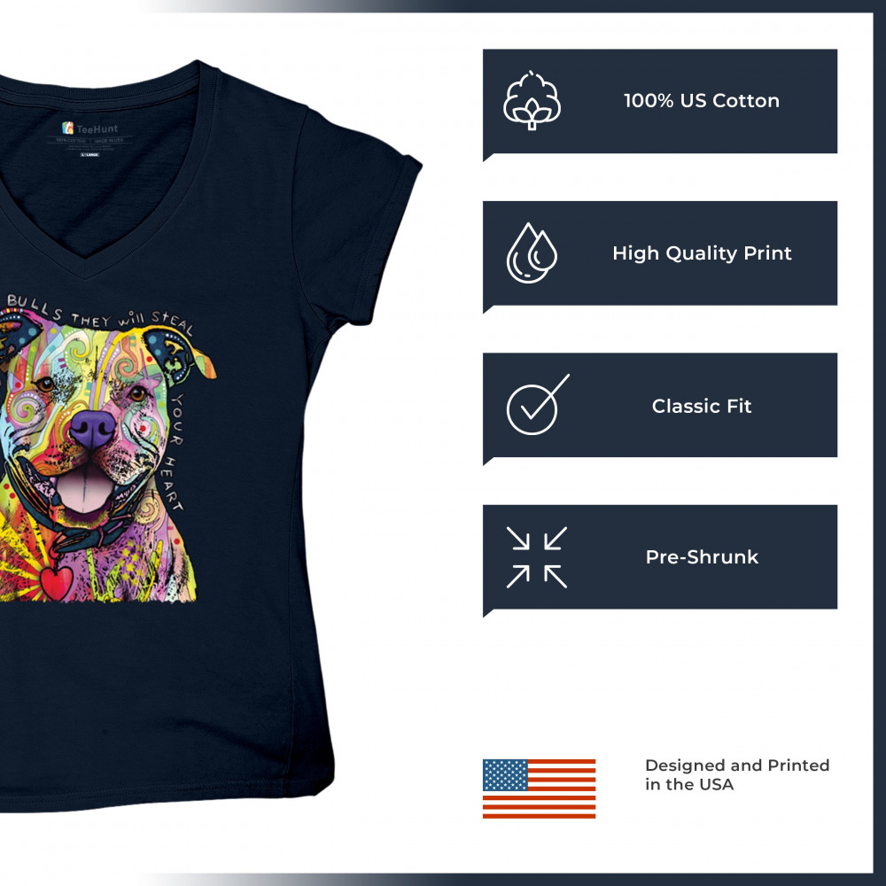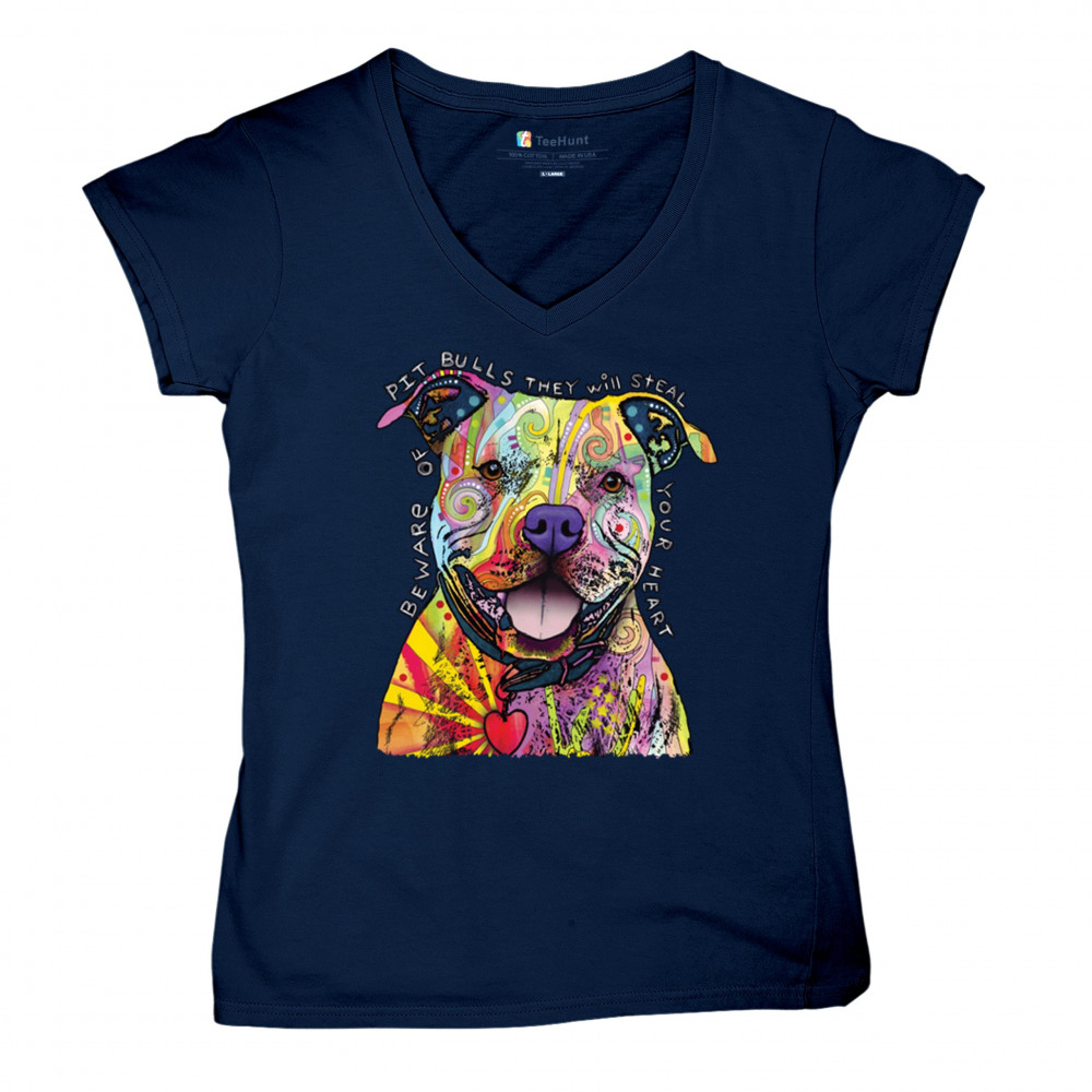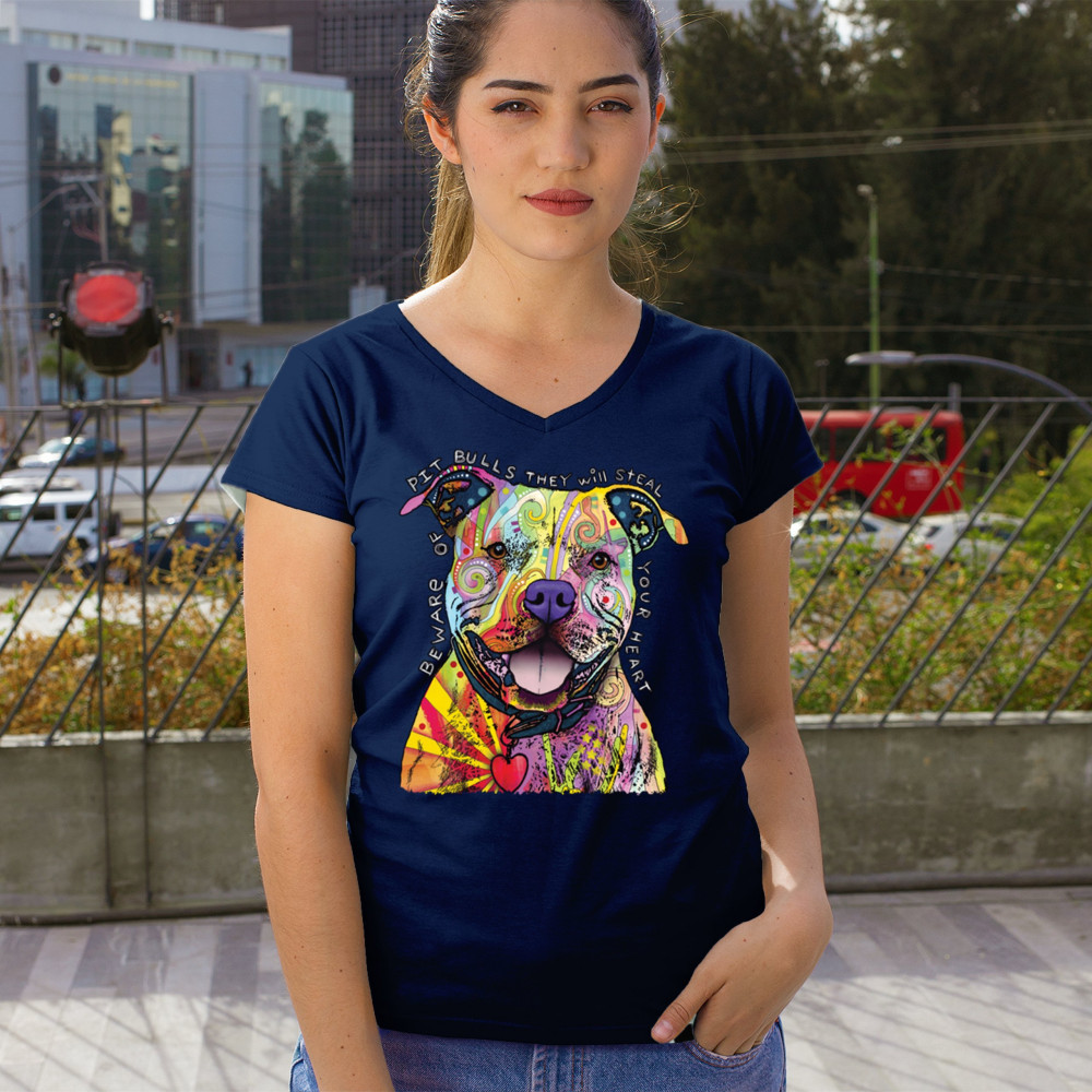 BEWARE OF PIT BULLS women's v-neck t-shirt dean russo art colorful cute dog tee navy blue