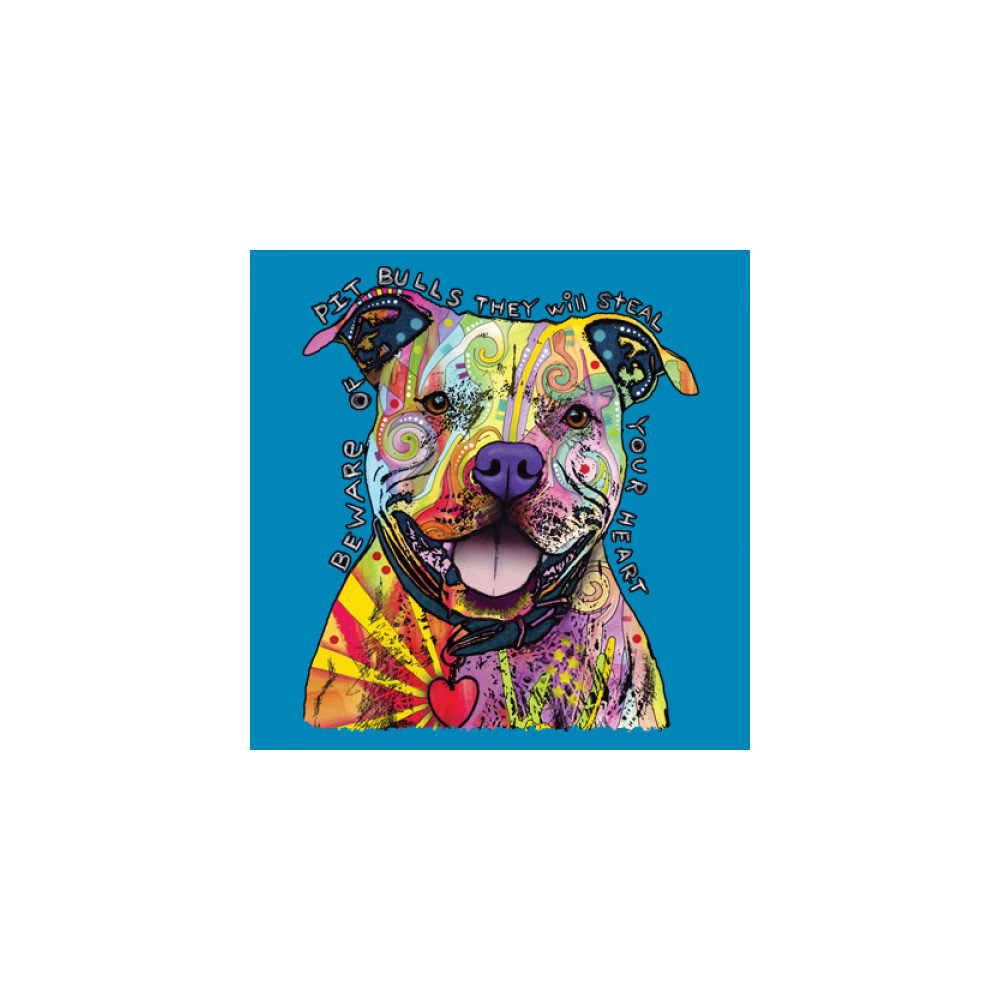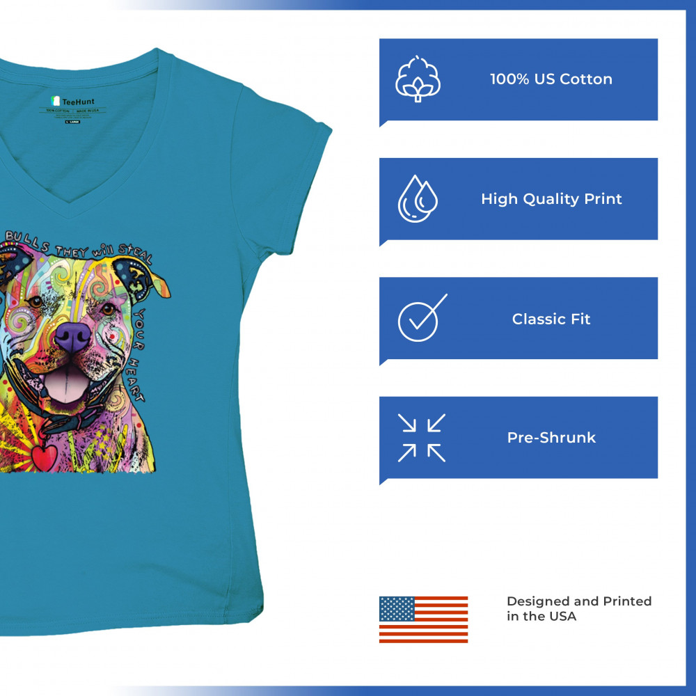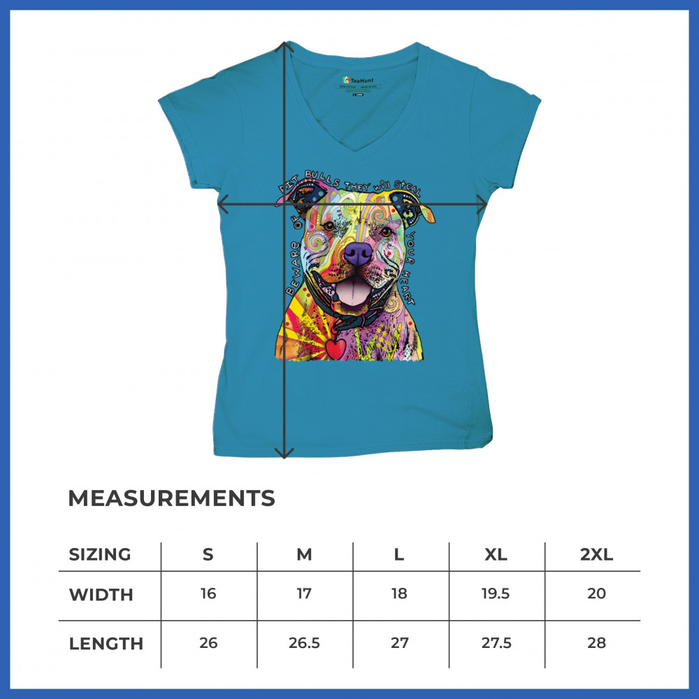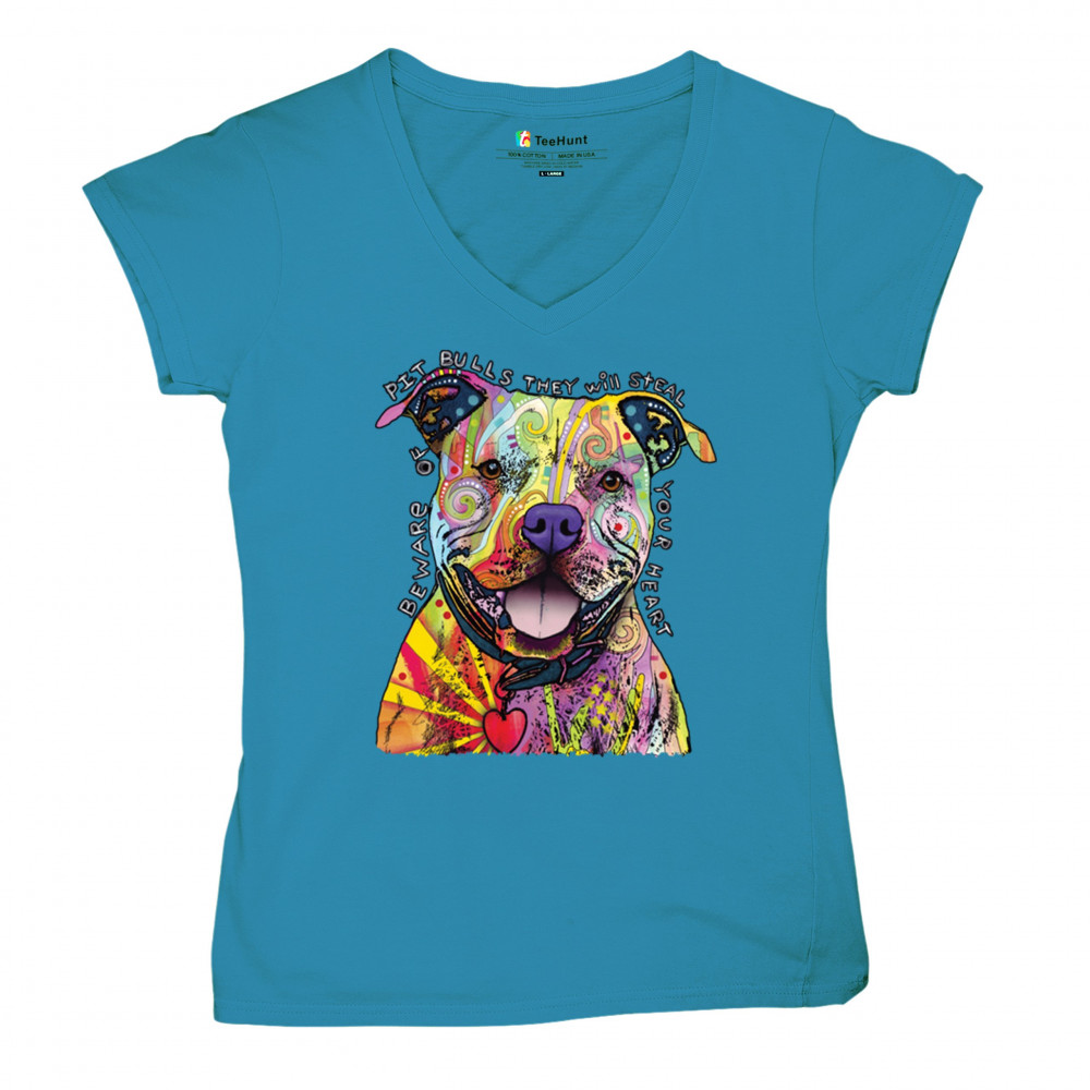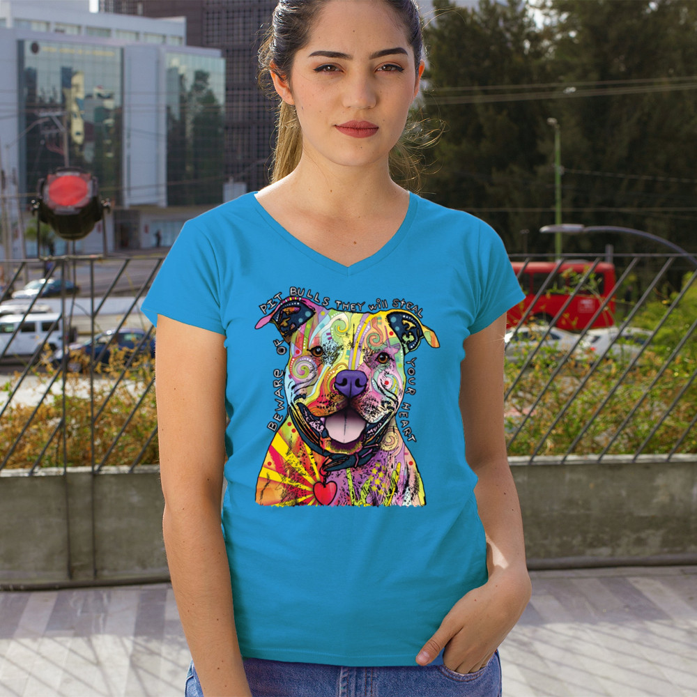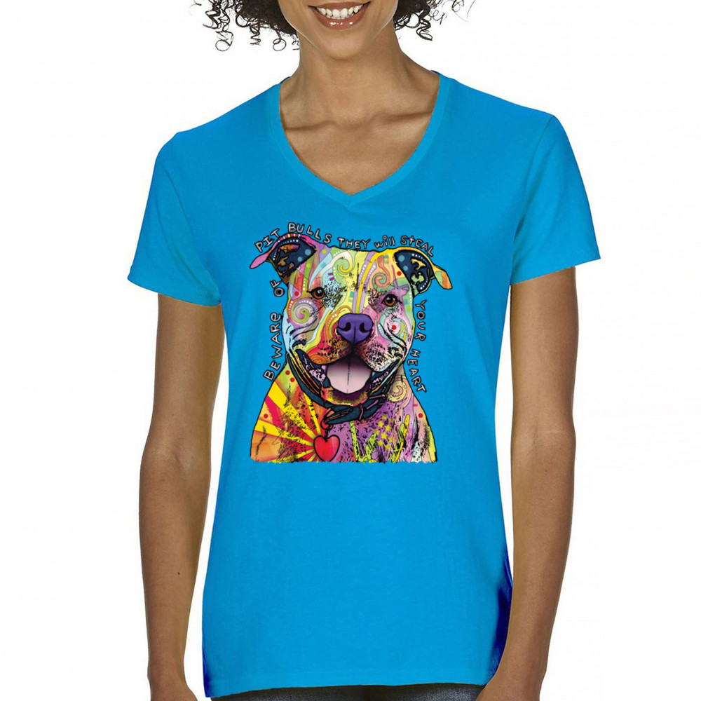BEWARE OF PIT BULLS women's v-neck t-shirt dean russo art colorful cute dog tee turquoise